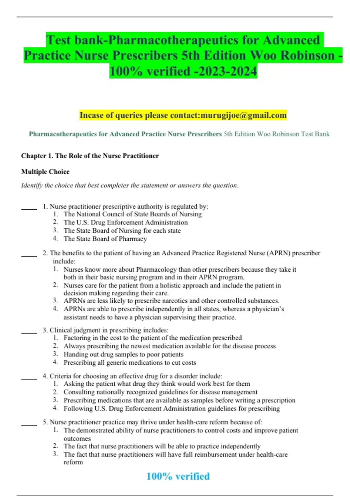 Test bank-Pharmacotherapeutics for Advanced Practice Nurse Prescribers 5th Edition Woo Robinson - 100% verified -