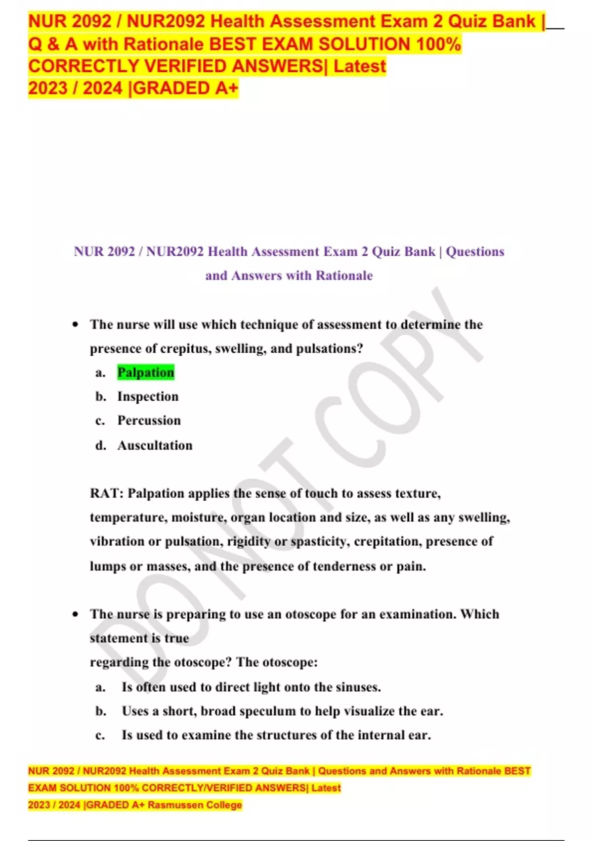 NUR 2092 / NUR2092 Health Assessment Exam 2 Quiz Bank | Q & A with Rationale BEST EXAM SOLUTION 100% CORRECTLY VERIFIED ANSWERS| Latest 2023 / 2024 |GRADED A+