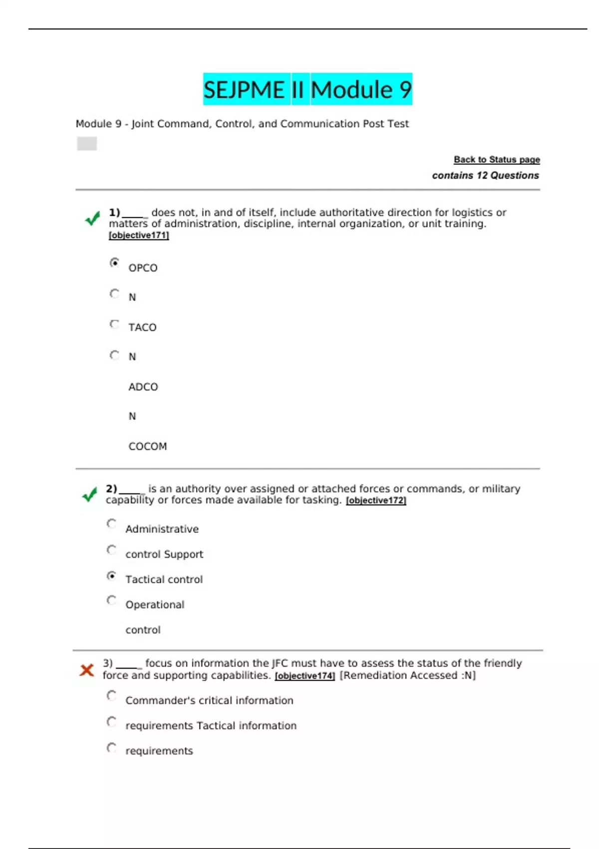 SEJPME II Module 9 Module 9 - Joint Command, Control, and Communication Post Test Back to Status page contains 12 Questions 1) _ does not, in and of itself, include authoritative direction for logistics or matters of administration, discipline, internal organization, or unit training. [objective171] OPCON TACON ADCON COCOM 2) _ is an authority over assigned or attached forces or commands, or military capability or forces made available for tasking. [objective172] Administrative control Support Tactical control Operational control