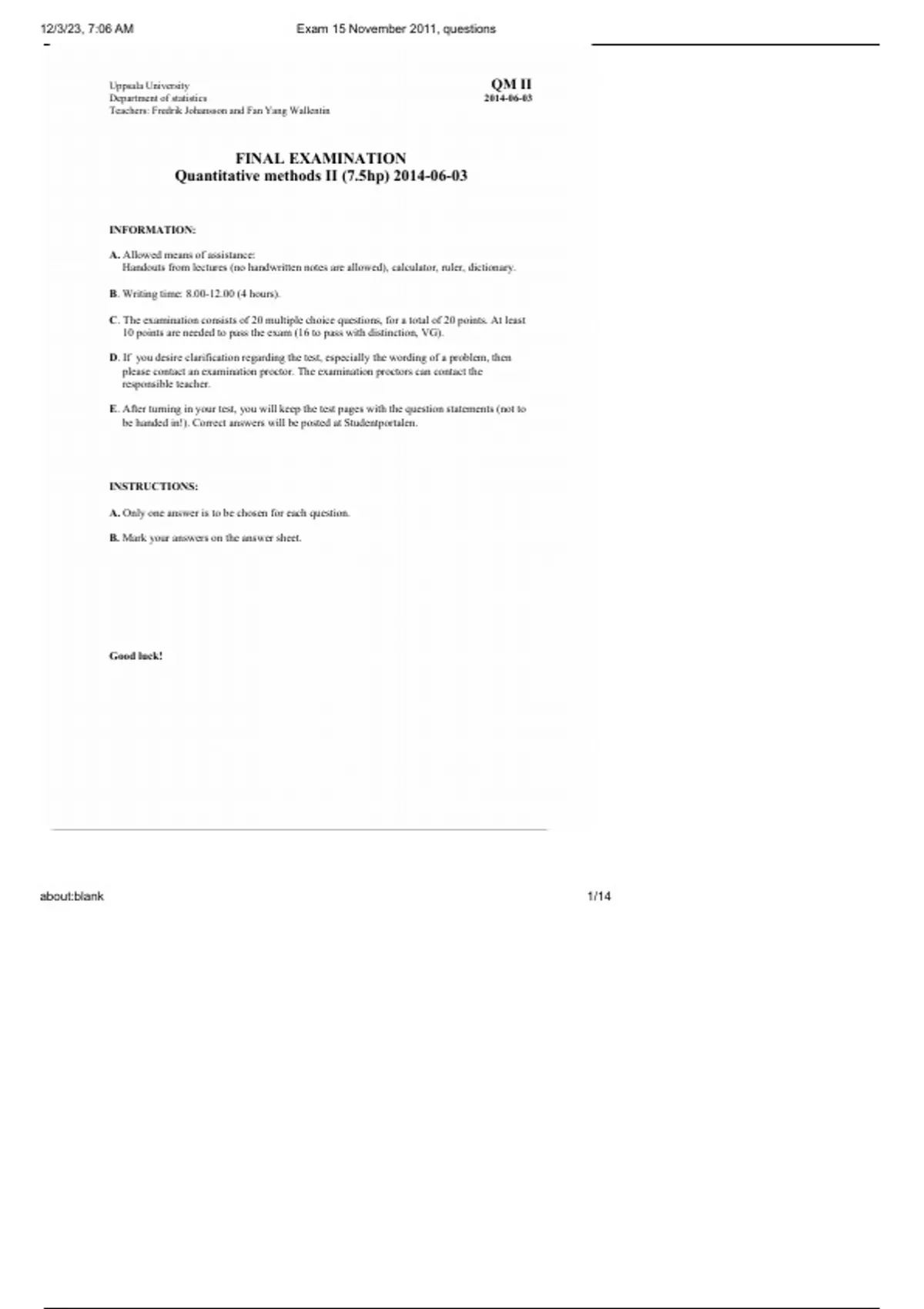 final examination quantitative methods ii 75hp
