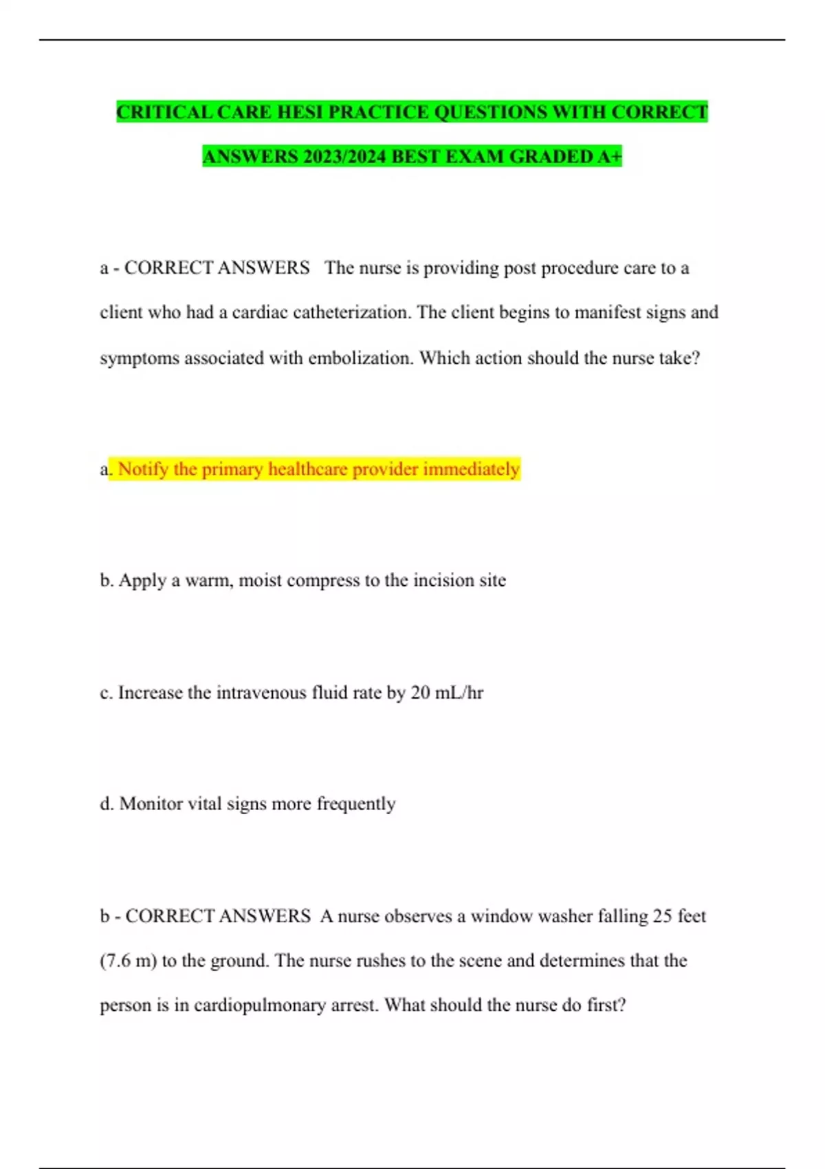 CRITICAL CARE HESI PRACTICE QUESTIONS WITH ANSWERS 2023/24 a - CORRECT ANSWERS The nurse is providing post procedure care to a client who had a cardiac catheterization. The client begins to manifest signs and symptoms associated with embolization. Which action should the nurse take? a. Notify the primary healthcare provider immediately b. Apply a warm, moist compress to the incision site c. Increase the intravenous fluid rate by 20 mL/hr d. Monitor vital signs more frequently b - CORRECT ANSWERS A nurse observes a window washer falling 25 feet (7.6 m) to the ground. The nurse rushes to the scene and determines that the person is in cardiopulmonary arrest. What should the nurse do first? a. Feel for a pulse b. Begin chest compressions c. Leave to call for assistance d. Perform the abdominal thrust maneuver d - CORRECT ANSWERS A client reports left-sided chest pain after playing racquetball. The client is hospitalized and diagnosed with left pneumothorax. When assessing the client's left chest area, the nurse expects to identify which finding? a. Dull sound on percussion b. Vocal fremitus on palpation c. Rales with rhonchi on auscultation d. Absence of breath sounds on auscultation c - CORRECT ANSWERS A client is admitted to the hospital with partial- and full-thickness burns of the chest and face sustained while trying to extinguish a brush fire. Which is the nurse's priority concern? a. Loss of skin integrity caused by the burns b. Potential infection as a result of the burn injury c. Inadequate gas exchange caused by smoke inhalation d. Decreased fluid volume because of the depth of the burns b - CORRECT ANSWERS During the first 48 hours after a client has sustained a thermal injury, which conditions should the nurse assess for? a. Hypokalemia and hyponatremia b. Hyperkalemia and hyponatremia c. Hypokalemia and hypernatremia d. Hyperkalemia and hypernatremia a - CORRECT ANSWERS A nurse is assessing a client's ECG reading. The client's atrial and ventricular heart rates are equal at 88 beats per min. The PR interval is 0.14 seconds, and the QRS width is 0.10 seconds. Rhythm is regular with normal P waves and QRS complexes. How will the nurse interpret this rhythm? a. Normal sinus rhythm b. Sinus tachycardia c. Sinus bradycardia d. Sinus arrhythmia b - CORRECT ANSWERS The nurse is caring for a client with a diagnosis of necrotizing fasciitis. Which is the priority concern of the nurse when caring for this client? a. Fluid volume b. Skin integrity c. Physical mobility d. Urinary elimination c - CORRECT ANSWERS A client who had extensive pelvic surgery 24 hours ago becomes cyanotic, is gasping for breath, and reports right-sided chest pain. What should the nurse do first? a. Obtain vital signs b. Initiate a cardiac arrest code c. Administer oxygen using a face mask d. Encourage the use of an incentive spirometer c - CORRECT ANSWERS A nurse is caring for a client with severe burns. The nurse determines that this client is at risk for hypovolemic shock. Which physiologic finding supports the nurse's conclusion? a. Decreased rate of glomerular filtration b. Excessive blood loss through the burned tissues c. Plasma proteins moving out of the intravascular compartment d. Sodium retention occurring as a result of the aldosterone mechanism a - CORRECT ANSWERS The nurse is caring for a client with burns and reviews the client's laboratory results: blood urea nitrogen (BUN), 30 mg/dL (10.2 mmol/L); creatinine, 2.4 mg/dL (184 mcmol/L); serum potassium, 6.3 mEq/L (6.3 mmol/L); pH, 7.1; Po 2, 90 mm Hg; and hemoglobin (Hgb), 7.4 g/dL (74 mmol/L). Which condition does the nurse suspect the client has based upon these findings? a. Azotemia b. Hypokalemia c. Metabolic alkalosis d. Respiratory alkalosis d - CORRECT ANSWERS A nurse is caring for a client who experienced serious burns in a fire. Which relationship between a client's burned body surface area and fluid loss should the nurse consider when evaluating fluid loss in a client with burns? a. Equal b. Unrelated c. Inversely related d. Directly proportional c - CORRECT ANSWERS A burn client is receiving the open method for wound treatment. Which information will the nurse explain to the client? a. Bathing will not be permitted. b. Dressings will be changed daily. c. Personal protective equipment will be worn by staff. d. Room temperature will be kept below 72° F (22.2° C). a - CORRECT ANSWERS A client presents to the emergency department with weakness and dizziness. The blood pressure is 90/60 mm Hg, pulse is 92 and weak, and body weight reflects a 3-pound (1.4 kilogram) loss in two days. The weather has been hot. Which condition should the nurse conclude is the priority for this client? a. Deficient fluid volume b. Impaired skin integrity c. Inadequate nutritional intake d. Decreased participation in activities b - CORRECT ANSWERS A client is admitted with severe burns. The nurse is caring for the client 36 hours after the client's admission and identifies the client's potassium level of 6.0 mEq/L (6.0 mmol/L). Which drink will the nurse recommend be included in the client's diet? a. Milk b. Tea c. Orange juice d. Tomato juice a - CORRECT ANSWERS A woman comes to the office of her healthcare provider reporting shortness of breath and epigastric distress that is not relieved by antacids. To which question would a woman experiencing a myocardial infarction respond differently than a man? a. "Do you have chest pain?" b. "Are you feeling anxious?" c. "Do you have any palpitations?" d. "Are you feeling short of breath?" b - CORRECT ANSWERS During a vertex vaginal birth the nurse notes meconium-stained amniotic fluid. What is the priority nursing intervention for the newborn? a. Stimulating crying b. Suctioning the airway c. Using an Ambu bag with oxygen support d. Placing the infant in the reverse Trendelenburg position c - CORRECT ANSWERS While receiving a blood transfusion, the client suddenly shouts, "I feel like someone is lowering a heavy weight on 