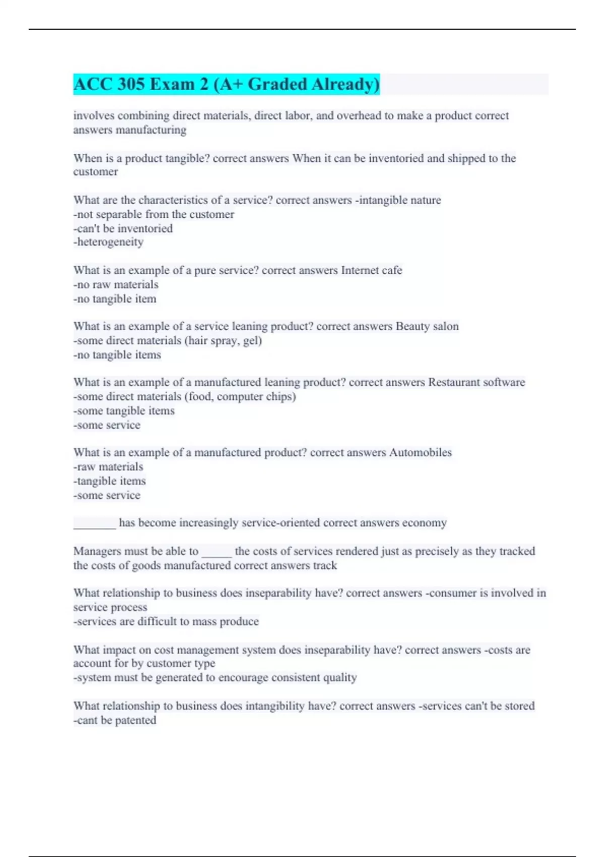involves combining direct materials, direct labor, and overhead to make a product correct answers manufacturing When is a product tangible? correct answers When it can be inventoried and shipped to the customer What are the characteristics of a service? correct answers -intangible nature -not separable from the customer -can't be inventoried -heterogeneity What is an example of a pure service? correct answers Internet cafe -no raw materials -no tangible item What is an example of a service leaning product? correct answers Beauty salon -some direct materials (hair spray, gel) -no tangible items What is an example of a manufactured leaning product? correct answers Restaurant software -some direct materials (food, computer chips) -some tangible items -some service What is an example of a manufactured product? correct answers Automobiles -raw materials -tangible items -some service _______ has become increasingly service-oriented correct answers economy Managers must be able to _____ the costs of services rendered just as precisely as they tracked the costs of goods manufactured correct answers track What relationship to business does inseparability have? correct answers -consumer is involved in service process -services are difficult to mass produce What impact on cost management system does inseparability have? correct answers -costs are account for by customer type -system must be generated to encourage consistent quality What relationship to business does intangibility have? correct answers -services can't be stored -cant be patented