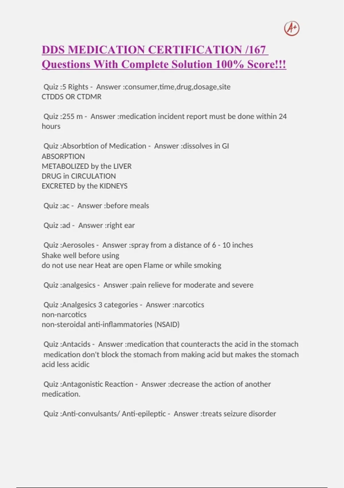 DDS MEDICATION CERTIFICATION /167 Questions With Complete Solution 100% Score!!!