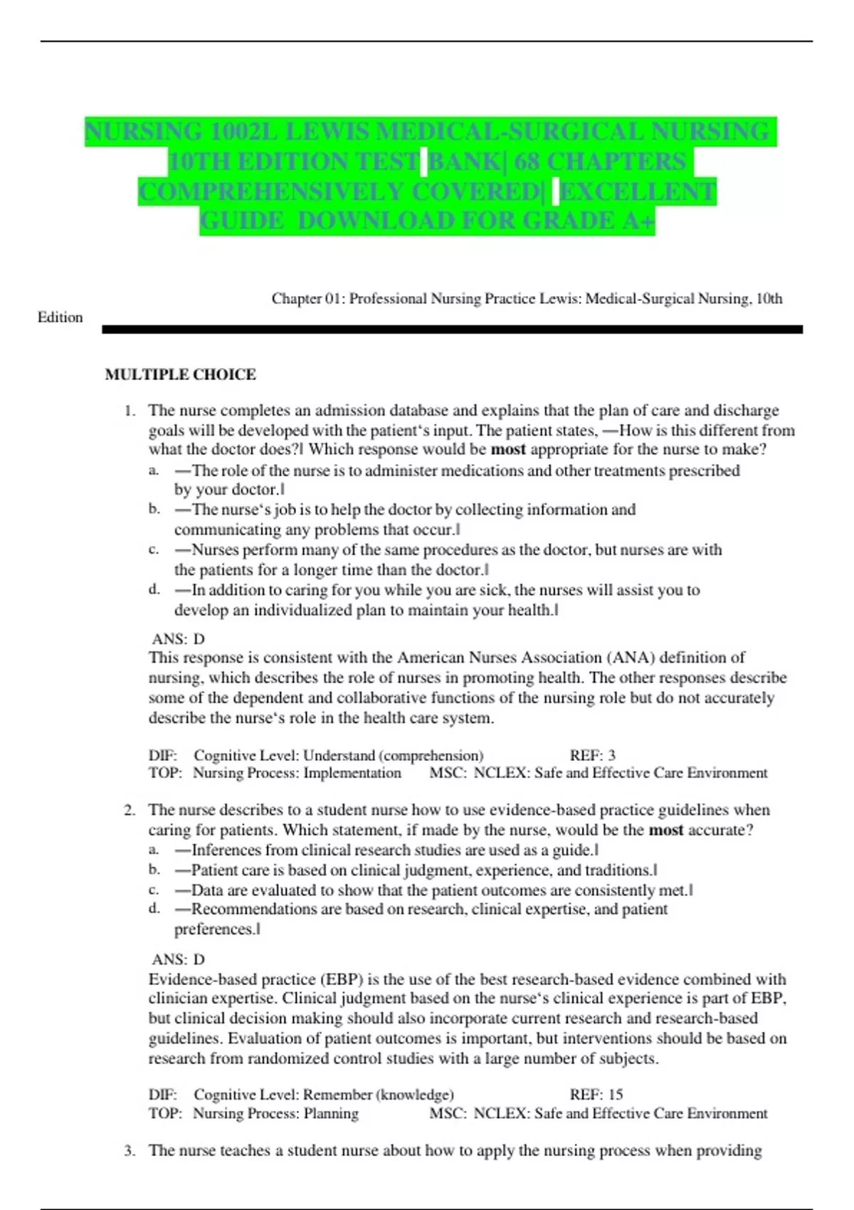 NURSING 1002L LEWIS MEDICAL-SURGICAL NURSING 10TH EDITION TEST BANK| 68 CHAPTERS COMPREHENSIVELY COVERED| 2023