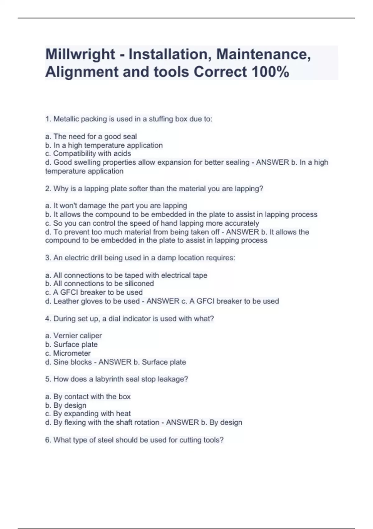 1. Metallic packing is used in a stuffing box due to: a. The need for a good seal b. In a high temperature application c. Compatibility with acids d. Good swelling properties allow expansion for better sealing - ANSWER b. In a high temperature application 2. Why is a lapping plate softer than the material you are lapping? a. It won't damage the part you are lapping b. It allows the compound to be embedded in the plate to assist in lapping process c. So you can control the speed of hand lapping more accurately d. To prevent too much material from being taken off - ANSWER b. It allows the compound to be embedded in the plate to assist in lapping process 3. An electric drill being used in a damp location requires: a. All connections to be taped with electrical tape b. All connections to be siliconed c. A GFCI breaker to be used d. Leather gloves to be used - ANSWER c. A GFCI breaker to be used 4. During set up, a dial indicator is used with what? a. Vernier caliper b. Surface plate c. Micrometer d. Sine blocks - ANSWER b. Surface plate 5. How does a labyrinth seal stop leakage? a. By contact with the box b. By design c. By expanding with heat d. By flexing with the shaft rotation - ANSWER b. By design 6. What type of steel should be used for cutting tools? a. High carbon steel b. Low carbon steel c. Tool steel d. Mild steel - ANSWER c. Tool steel 7. You need to shim a pump. You determine that it requires a 1/64", 1/8" 3/64" 5/32" and ½" shim. What is the total shim thickness? a. 27/32" b. 5/8" c. ¾" d. 29/64" - ANSWER a. 27/32" (1+8+3+10+32)/64" = 54/64" = 27/32" 8. What is the best method for sharpening a scribing tool? a. Bench grinder b. Point grinder c. Honing d. Lapping plate - ANSWER c. Honing 9. Upon catastrophic failure, what type of maintenance is performed? a. Reactive b. Proactive c. Preventative d. Predictive - ANSWER a. Reactive 10. When must a planned maintenance program schedule be overlooked? a. During start up b. Whenever there is a safety concern c. At the end of a shift d. Whenever a mechanic wants to work on a machine - ANSWER b. Whenever there is a safety concern 11. When tempering a hand tool, what cools the tool the quickest? a. Lime b. Oil c. Air d. Water - ANSWER d. Water 12. If you use a drill with a fixed rate of speed and it is turning too slowly, what will happen? a. Drill bit will break b. Drill will get stuck in the work piece c. Hole will be oblong d. One lip length will wear and become uneven - ANSWER a. Drill bit will break 13. How do you best communicate with other trades? a. Listen b. Repeat info back to confirm c. Process the information later d. Guess - ANSWER b. Repeat info back to confirm 14. Who generates a work order? a. Any employee with a concern b. A supervisor c. Laborer d. Mechanics - ANSWER b. A supervisor 15. What type of maintenance uses technical reports to determine a schedule? a. Scheduled maintenance b. Preventative c. Breakdown d. Routine - ANSWER b. Preventative 16. What is important to remember when mounting a pump and motor? a. Type of liquid being pumped b. Style of coupling c. Size of the pumping chambers d. Temperature of liquid being pumped - ANSWER d. Temperature of liquid being pumped 17. If a plunger is out .012" after rotating 180 degrees, how much should you shim it? a. .012" b. .006" c. .003" d. .010" - ANSWER b. .006" 18. If a micrometer is inaccurate, what should
