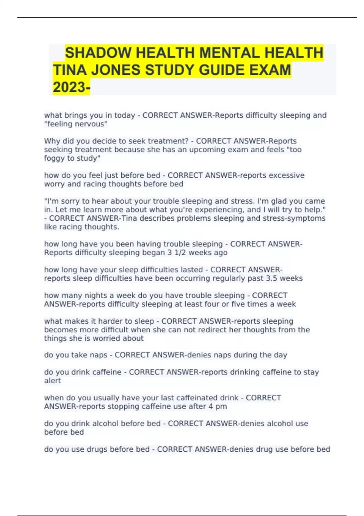 Shadow Health Mental Health TINA JONES Study Guide Exam 2023/24 what brings you in today - CORRECT ANSWER-Reports difficulty sleeping and "feeling nervous" Why did you decide to seek treatment? - CORRECT ANSWER-Reports seeking treatment because she has an upcoming exam and feels "too foggy to study" how do you feel just before bed - CORRECT ANSWER-reports excessive worry and racing thoughts before bed "I'm sorry to hear about your trouble sleeping and stress. I'm glad you came in. Let me learn more about what you're experiencing, and I will try to help." - CORRECT ANSWER-Tina describes problems sleeping and stress-symptoms like racing thoughts. how long have you been having trouble sleeping - CORRECT ANSWER-Reports difficulty sleeping began 3 1/2 weeks ago how long have your sleep difficulties lasted - CORRECT ANSWER-reports sleep difficulties have been occurring regularly past 3.5 weeks how many nights a week do you have trouble sleeping - CORRECT ANSWER-reports difficulty sleeping at least four or five times a week what makes it harder to sleep - CORRECT ANSWER-reports sleeping becomes more difficult when she can not redirect her thoughts from the things she is worried about do you take naps - CORRECT ANSWER-denies naps during the day do you drink caffeine - CORRECT ANSWER-reports drinking caffeine to stay alert when do you usually have your last caffeinated drink - CORRECT ANSWER-reports stopping caffeine use after 4 pm do you drink alcohol before bed - CORRECT ANSWER-denies alcohol use before bed do you use drugs before bed - CORRECT ANSWER-denies drug use before bed do you think your sleep problems could be due to breathing issues - CORRECT ANSWER-reports respiratory problems are controlled and not interfering with sleep what helps you sleep - CORRECT ANSWER-reports sleeping more easily if she can distract herself from her racing thoughts do you exercise - CORRECT ANSWER-reports no exercise how does your lack of sleep affect your daily life - CORRECT ANSWER-reports feeling tired and out of it most of the time during the day due to lack of sleep have you been falling asleep when you didnt mean to - CORRECT ANSWER-reports no increased chance of drifting off during the day despite lack of sleep what do you mean when you say you feel out of it - CORRECT ANSWER-reports feeling slowed down and tired, having trouble focusing, and generally feeling less sharp can you tell me about how your anxiety feels - CORRECT ANSWER-reports feelings of anxiety as thoughts she cant turn off and being on edge do you ever have a sense of impending doom - CORRECT ANSWER-reports worry about the future but no sense of impending doom have you been having panic attacks - CORRECT ANSWER-reports no panic attacks have you been having trouble concentrating - CORRECT ANSWER-reports difficulty concentrating due to fatigue from lack of sleep do you feel restless - CORRECT ANSWER-reports only restlessness occurs just before bed do you feel irritable - CORRECT ANSWER-reports slight irritability due to fatigue how does your anxiety interfere with your daily life - CORRECT ANSWER-reports stress only interferes with daily life because it interrupts her sleep how often do you awaken during the night - CORRECT ANSWER-reports waking up two or three times during the night for at least 10 minutes how do you feel when you wake up in the morning - CORRECT ANSWER-reports waking in the morning feeling out of it and not rested when do you go to bed - CORRECT ANSWER-reports going to bed around midnight but feeling too nervous to sleep when do you fall asleep - CORRECT ANSWER-reports actually falling asleep at 2 or 3 am . . . . . . . . .