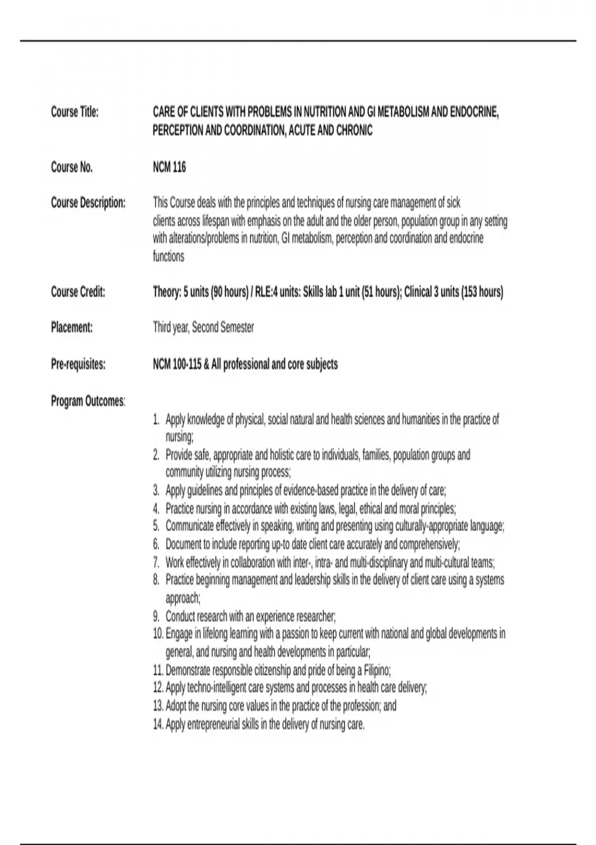 NCM 116 Care of Clients with Problems in Nutrition and GI Metabolism and Endocrine