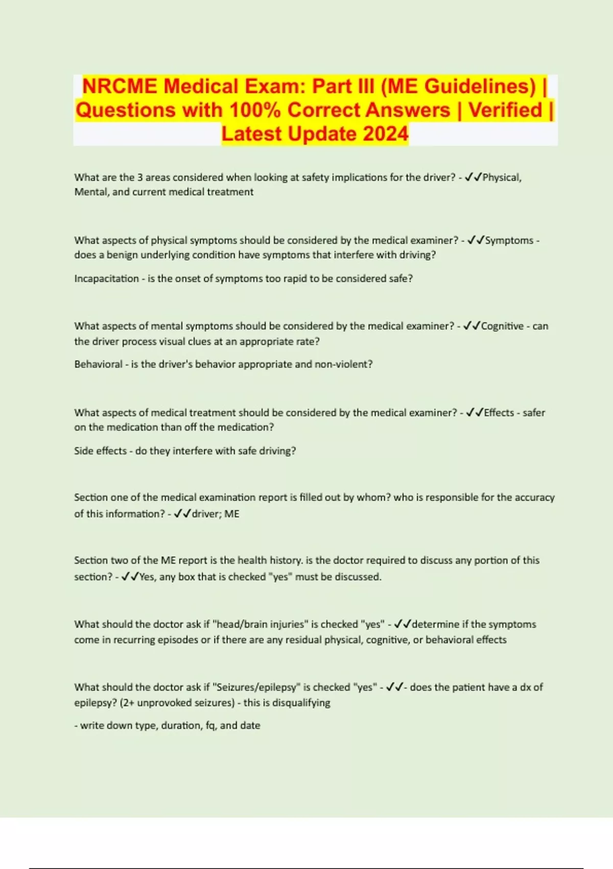 NRCME Medical Exam: Part III (ME Guidelines) | Questions with 100% Correct Answers | Verified | Latest Update 2024