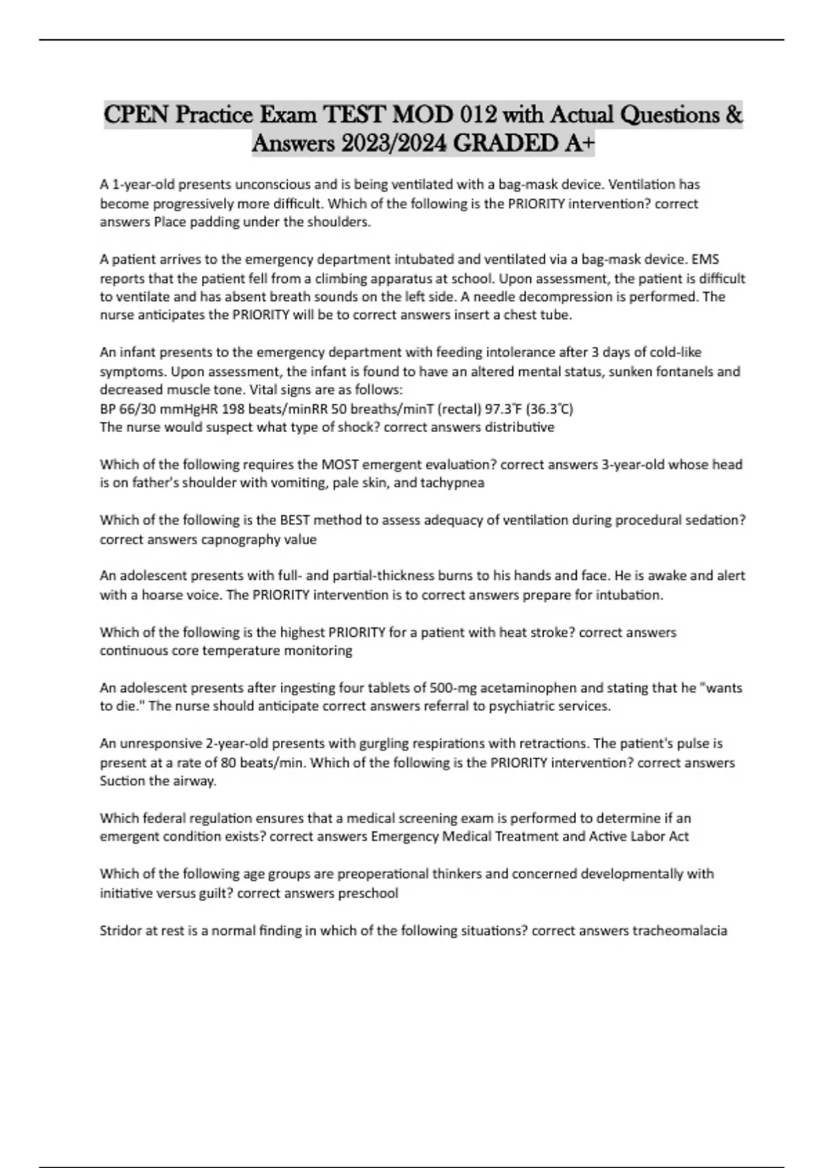 CPEN Practice Exam TEST MOD 012 with Actual Questions & Answers 2023/2024 GRADED A+ A 1-year-old presents unconscious and is being ventilated with a bag-mask device. Ventilation has become progressively more difficult. Which of the following is the PRIORITY intervention? correct answers Place padding under the shoulders. A patient arrives to the emergency department intubated and ventilated via a bag-mask device. EMS reports that the patient fell from a climbing apparatus at school. Upon assessment, the patient is difficult to ventilate and has absent breath sounds on the left side. A needle decompression is performed. The nurse anticipates the PRIORITY will be to correct answers insert a chest tube. An infant presents to the emergency department with feeding intolerance after 3 days of cold-like symptoms. Upon assessment, the infant is found to have an altered mental status, sunken fontanels and decreased muscle tone. Vital signs are as follows: BP 66/30 mmHgHR 198 beats/minRR 50 breaths/minT (rectal) 97.3˚ F (36.3˚ C) The nurse would suspect what type of shock? correct answers distributive Which of the following requires the MOST emergent evaluation? correct answers 3-year-old whose head is on father's shoulder with vomiting, pale skin, and tachypnea Which of the following is the BEST method to assess adequacy of ventilation during procedural sedation? correct answers capnography value An adolescent presents with full- and partial-thickness burns to his hands and face. He is awake and alert with a hoarse voice. The PRIORITY intervention is to correct answers prepare for intubation. Which of the following is the highest PRIORITY for a patient with heat stroke? correct answers continuous core temperature monitoring An adolescent presents after ingesting four tablets of 500-mg acetaminophen and stating that he "wants to die." The nurse should anticipate correct answers referral to psychiatric services. An unresponsive 2-year-old presents with gurgling respirations with retractions. The patient's pulse is present at a rate of 80 beats/min. Which of the following is the PRIORITY intervention? correct answers Suction the airway. Which federal regulation ensures that a medical screening exam is performed to determine if an emergent condition exists? correct answers Emergency Medical Treatment and Active Labor Act Which of the following age groups are preoperational thinkers and concerned developmentally with initiative versus guilt? correct answers preschool Stridor at rest is a normal finding in which of the following situations? correct answers tracheomalacia EMS arrives with a 6-year-old who was an improperly restrained rear-seat passenger in a head-on collision. The patient complains of diffuse abdominal pain, nausea, and is tachycardic. Which injury should the nurse MOST suspect? correct answers small bowel injury The appropriate method of tick removal within 24 hours is to correct answers pull in a steady slow motion. A school-aged child with hydrocephalus may present with which of the following physical findings? correct answers papilledema