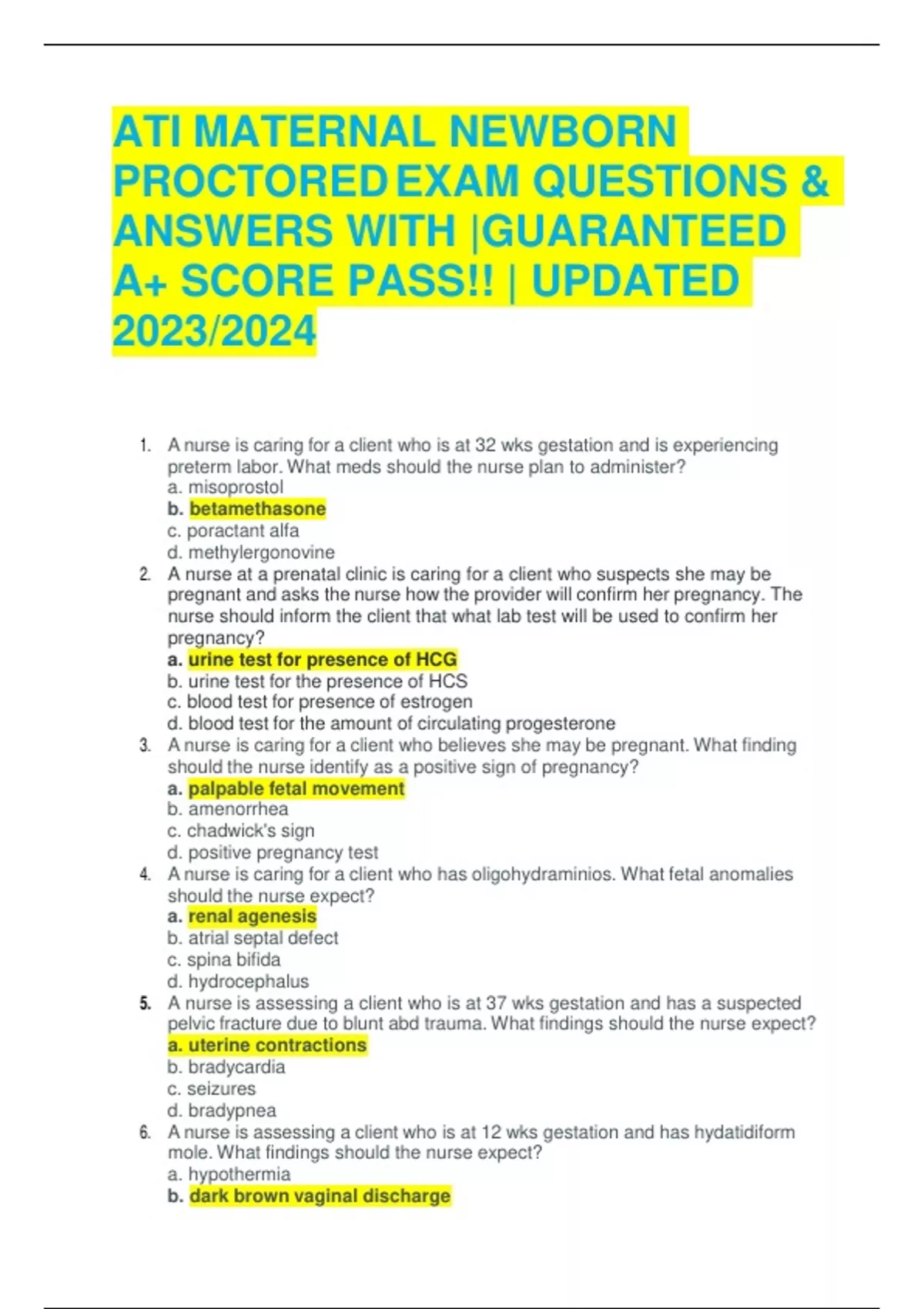 ATI MATERNAL NEWBORN PROCTOREDEXAM QUESTIONS & ANSWERS WITH |GUARANTEED A+ SCORE PASS!! | UPDATED 2023/2024