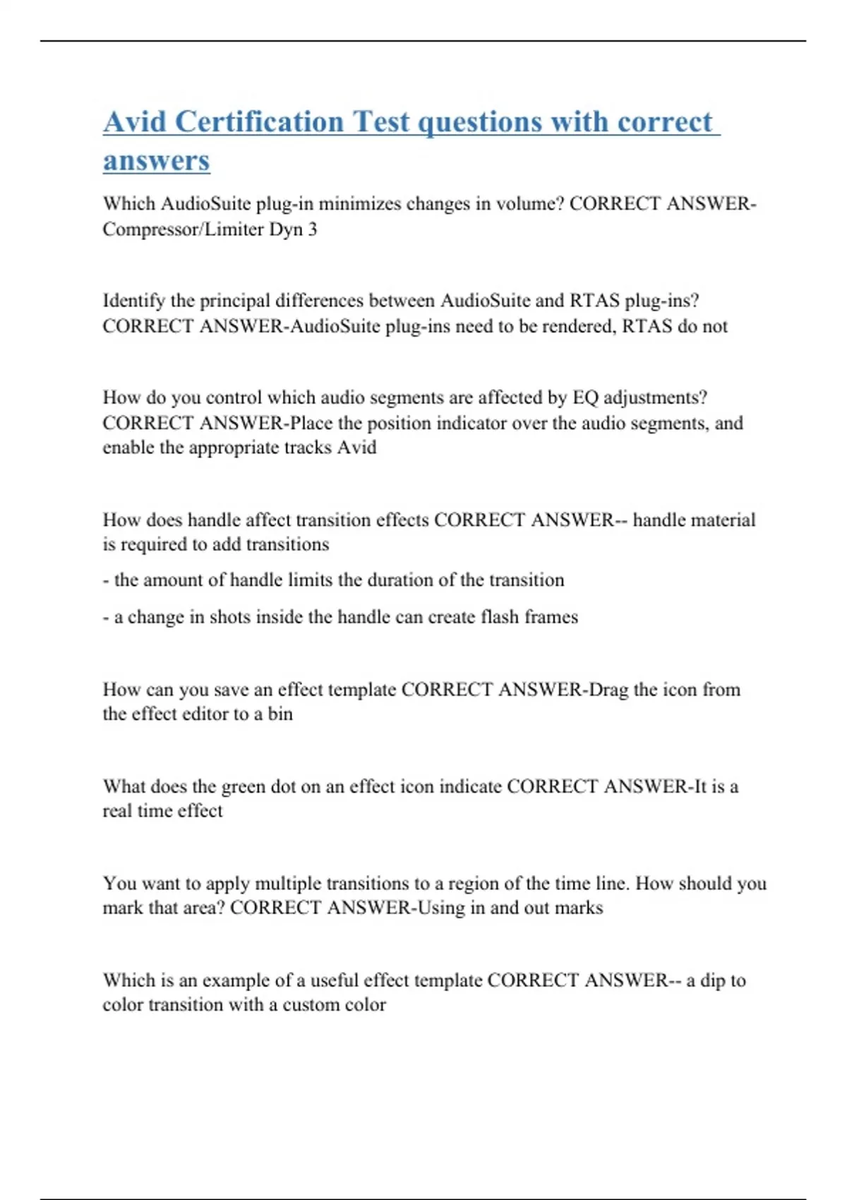 Which AudioSuite plug-in minimizes changes in volume? CORRECT ANSWER-Compressor/Limiter Dyn 3 Identify the principal differences between AudioSuite and RTAS plug-ins? CORRECT ANSWER-AudioSuite plug-ins need to be rendered, RTAS do not How do you control which audio segments are affected by EQ adjustments? CORRECT ANSWER-Place the position indicator over the audio segments, and enable the appropriate tracks Avid How does handle affect transition effects CORRECT ANSWER-- handle material is required to add transitions - the amount of handle limits the duration of the transition - a change in shots inside the handle can create flash frames How can you save an effect template CORRECT ANSWER-Drag the icon from the effect editor to a bin What does the green dot on an effect icon indicate CORRECT ANSWER-It is a real time effect You want to apply multiple transitions to a region of the time line. How should you mark that area? CORRECT ANSWER-Using in and out marks Which is an example of a useful effect temp