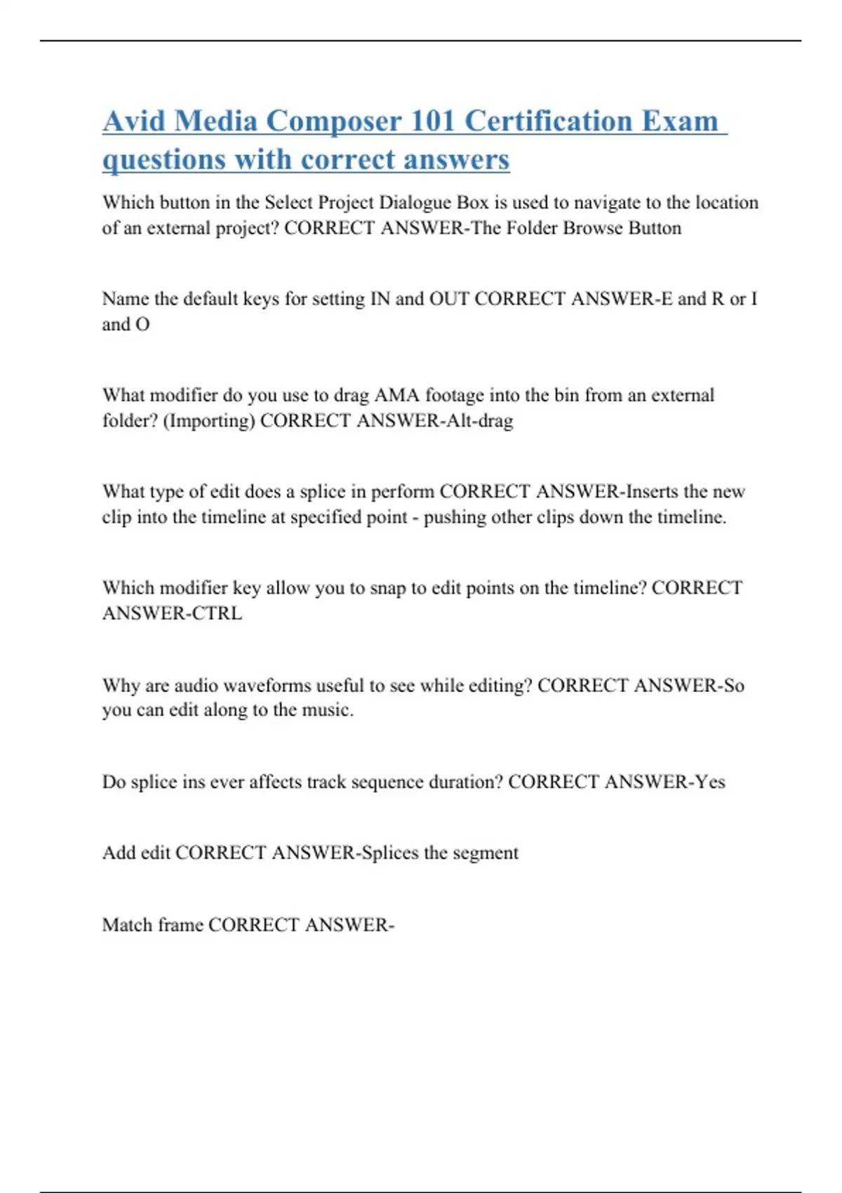 Which button in the Select Project Dialogue Box is used to navigate to the location of an external project? CORRECT ANSWER-The Folder Browse Button Name the default keys for setting IN and OUT CORRECT ANSWER-E and R or I and O What modifier do you use to drag AMA footage into the bin from an external folder? (Importing) CORRECT ANSWER-Alt-drag What type of edit does a splice in perform CORRECT ANSWER-Inserts the new clip into the timeline at specified point - pushing other clips down the timeline. Which modifier key allow you to snap to edit points on the timeline? CORRECT ANSWER-CTRL Why are audio waveforms useful to see while editing? CORRECT ANSWER-So you can edit along to the music. Do splice ins ever affects track sequence duration? CORRECT ANSWER-Yes