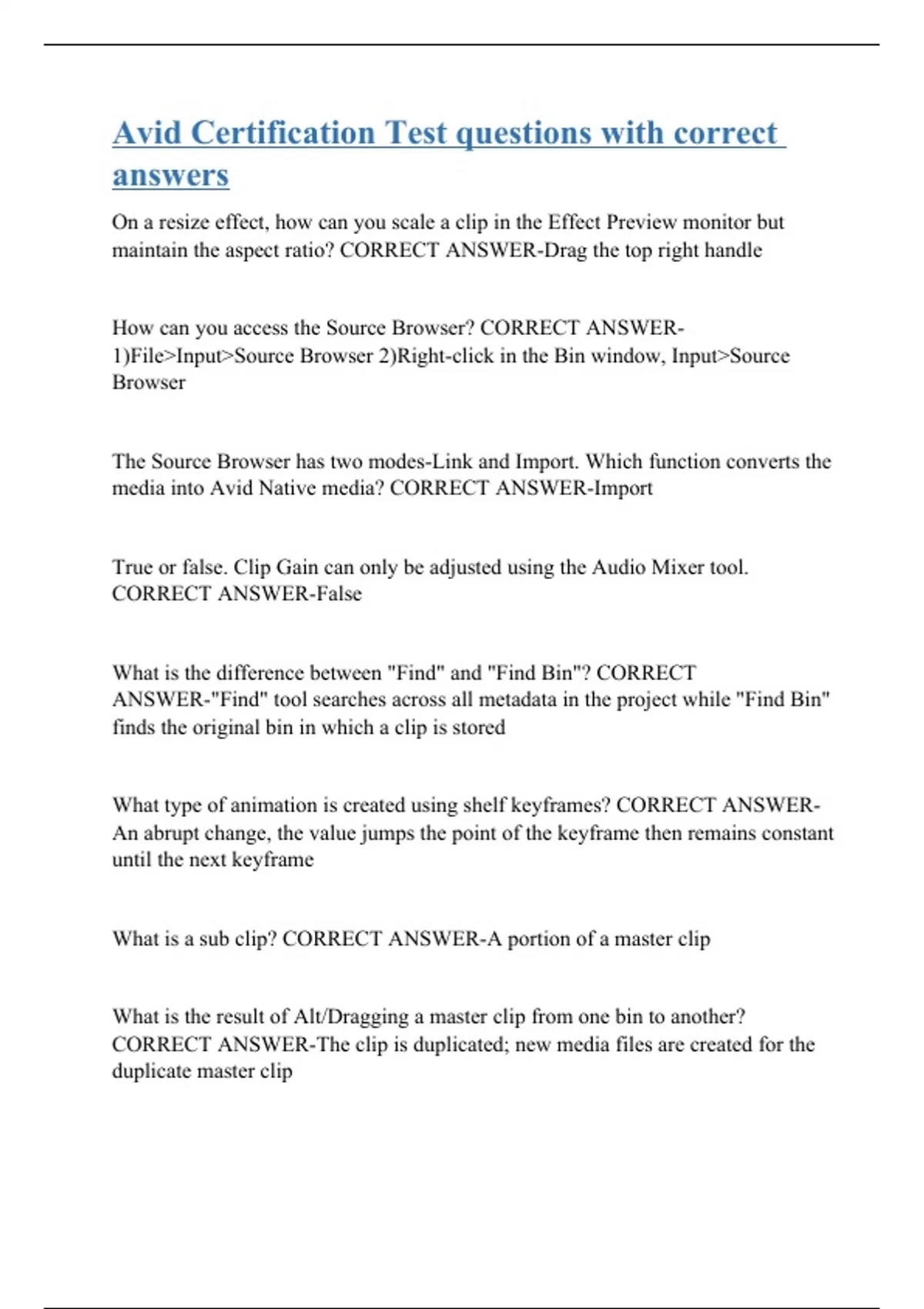 On a resize effect, how can you scale a clip in the Effect Preview monitor but maintain the aspect ratio? CORRECT ANSWER-Drag the top right handle How can you access the Source Browser? CORRECT ANSWER-1)File>Input>Source Browser 2)Right-click in the Bin window, Input>Source Browser The Source Browser has two modes-Link and Import. Which function converts the media into Avid Native media? CORRECT ANSWER-Import True or false. Clip Gain can only be adjusted using the Audio Mixer tool. CORRECT ANSWER-False What is the difference between "Find" and "Find Bin"? CORRECT ANSWER-"Find" tool searches across all metadata in the project while "Find Bin" finds the original bin in which a clip is stored What type of animation is created using shelf keyframes? CORRECT ANSWER-An abrupt change, the value jumps the point of the keyframe then remains constant until the next keyframe What is a sub clip? CORRECT ANSWER-A portion of a master clip What is the result of Alt/Dragging a master clip from one bin to another? CORRECT ANSWER-The clip is duplicated; new media files are created for the duplicate master clip