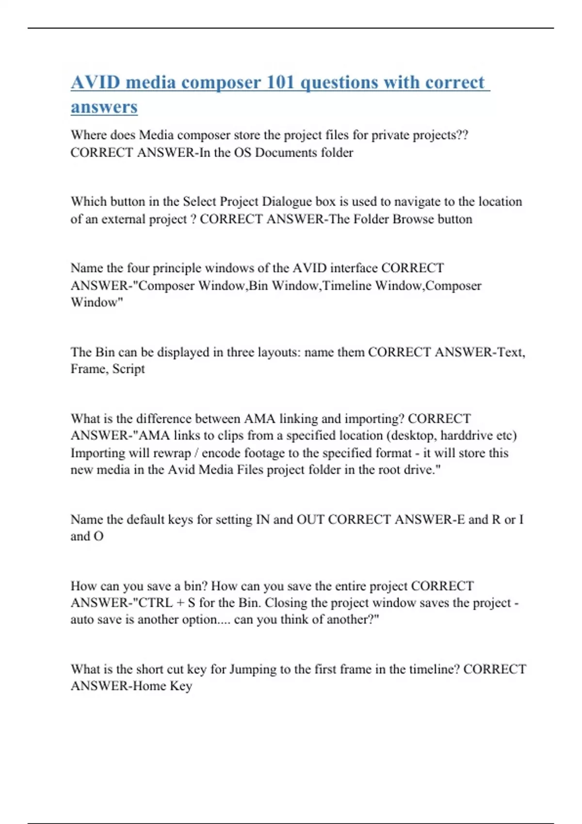 Where does Media composer store the project files for private projects?? CORRECT ANSWER-In the OS Documents folder Which button in the Select Project Dialogue box is used to navigate to the location of an external project ? CORRECT ANSWER-The Folder Browse button Name the four principle windows of the AVID interface CORRECT ANSWER-"Composer Window,Bin Window,Timeline Window,Composer Window" The Bin can be displayed in three layouts: name them CORRECT ANSWER-Text, Frame, Script What is the difference between AMA linking and importing? CORRECT ANSWER-"AMA links to clips from a specified location (desktop, harddrive etc) Importing will rewrap / encode footage to the specified format - it will store this new media in the Avid Media Files project folder in the root drive." Name the default keys for setting IN and OUT CORRECT ANSWER-E and R or I and O How can you save a bin? How can you save the entire project CORRECT ANSWER-"CTRL + S for the Bin. Closing the project window saves the project - auto save is another option.... can you think of another?" What is the short cut key for Jumping to the first frame in the timeline? CORRECT ANSWER-Home Key