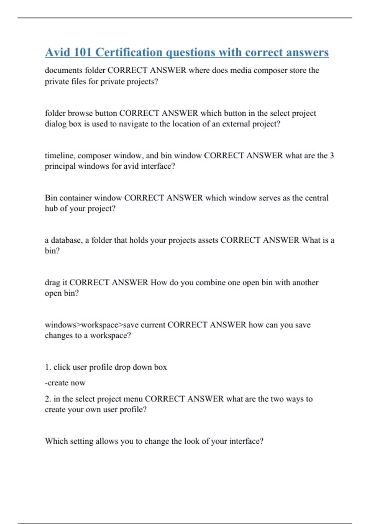 documents folder CORRECT ANSWER where does media composer store the private files for private projects? folder browse button CORRECT ANSWER which button in the select project dialog box is used to navigate to the location of an external project? timeline, composer window, and bin window CORRECT ANSWER what are the 3 principal windows for avid interface? Bin container window CORRECT ANSWER which window serves as the central hub of your project? a database, a folder that holds your projects assets CORRECT ANSWER What is a bin? drag it CORRECT ANSWER How do you combine one open bin with another open bin? windows>workspace>save current CORRECT ANSWER how can you save changes to a workspace? 1. click user profile drop down box