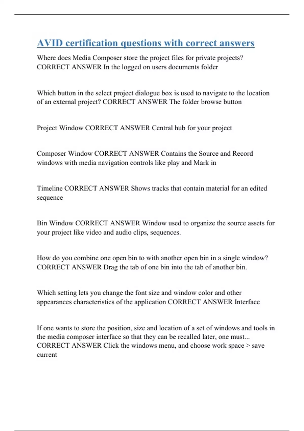 Where does Media Composer store the project files for private projects? CORRECT ANSWER In the logged on users documents folder Which button in the select project dialogue box is used to navigate to the location of an external project? CORRECT ANSWER The folder browse button Project Window CORRECT ANSWER Central hub for your project Composer Window CORRECT ANSWER Contains the Source and Record windows with media navigation controls like play and Mark in Timeline CORRECT ANSWER Shows tracks that contain material for an edited sequence Bin Window CORRECT ANSWER Window used to organize the source assets for your project like video and audio clips, sequences. How do you combine one open bin to with another open bin in a single window? CORRECT ANSWER Drag the tab of one bin into the tab of another bin. Which setting lets you change the font size and window color and other appearances characteristics of the application CORRECT ANSWER Interface If one wants to store the position, size and location of a set of windows and tools in the media composer interface so that they can be recalled later, one must... CORRECT ANSWER Click the windows m