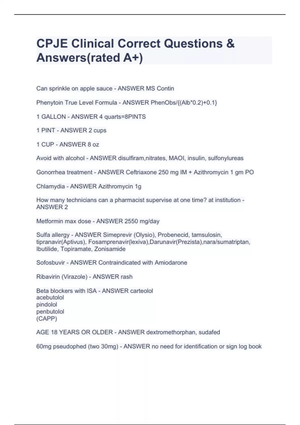 CPJE Clinical Correct Questions & Answers(rCan sprinkle on apple sauce - ANSWER MS Contin Phenytoin True Level Formula - ANSWER PhenObs/{(Alb*0.2)+0.1} 1 GALLON - ANSWER 4 quarts=8PINTS 1 PINT - ANSWER 2 cups 1 CUP - ANSWER 8 oz Avoid with alcohol - ANSWER disulfiram,nitrates, MAOI, insulin, sulfonylureas Gonorrhea treatment - ANSWER Ceftriaxone 250 mg IM + Azithromycin 1 gm PO Chlamydia - ANSWER Azithromycin 1g How many technicians can a pharmacist supervise at one time? at institution - ANSWER 2 Metformin max dose - ANSWER 2550 mg/day Sulfa allergy - ANSWER Simeprevir (Olysio), Probenecid, tamsulosin, tipranavir(Aptivus), Fosamprenavir(lexiva),Darunavir(Prezista),nara/sumatriptan, Ibutilide, Topiramate, Zonisamide Sofosbuvir - ANSWER Contraindicated with Amiodarone Ribavirin (Virazole) - ANSWER rash ated A+)