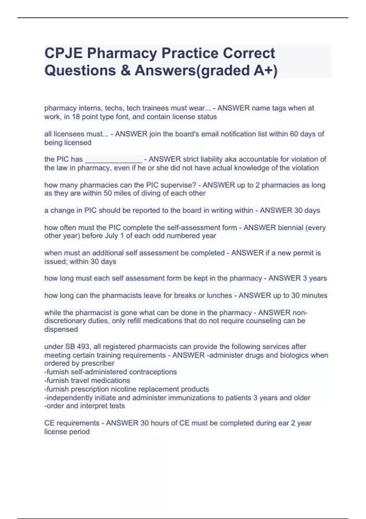 CPJE Pharmacy Practice Correct Questions & Answers(graded A+) CPJE Pharmacy Practice Correct Questions & Answers(graded A+) pharmacy interns, techs, tech trainees must wear... - ANSWER name tags when at work, in 18 point type font, and contain license status all licensees must... - ANSWER join the board's email notification list within 60 days of being licensed the PIC has ______________ - ANSWER strict liability aka accountable for violation of the law in pharmacy, even if he or she did not have actual knowledge of the violation how many pharmacies can the PIC supervise? - ANSWER up to 2 pharmacies as long as they are within 50 miles of diving of each other a change in PIC should be reported to the board in writing within - ANSWER 30 days how often must the PIC complete the self-assessment form - ANSWER biennial (every other year) before July 1 of each odd numbered year when must an additional self assessment be completed - ANSWER if a new permit is issued; within 30 days how long must each self assessment form be kept in the pharmacy - ANSWER 3 years how long can the pharmacists leave for breaks or lunches - ANSWER up to 30 minutes while the pharmacist is gone what can be done in the pharmacy - ANSWER non-discretionary duties, only refill medications that do not require counseling can be dispensed under SB 493, all registered pharmacists can provide the following services after meeting certain training requirements - ANSWER -administer drugs and biologics when ordered by prescriber -furnish self-administered contraceptions -furnish travel medications -furnish prescription nicotine replacement products -independently initiate and administer immunizations to patients 3 years and older -order and interpret tests
