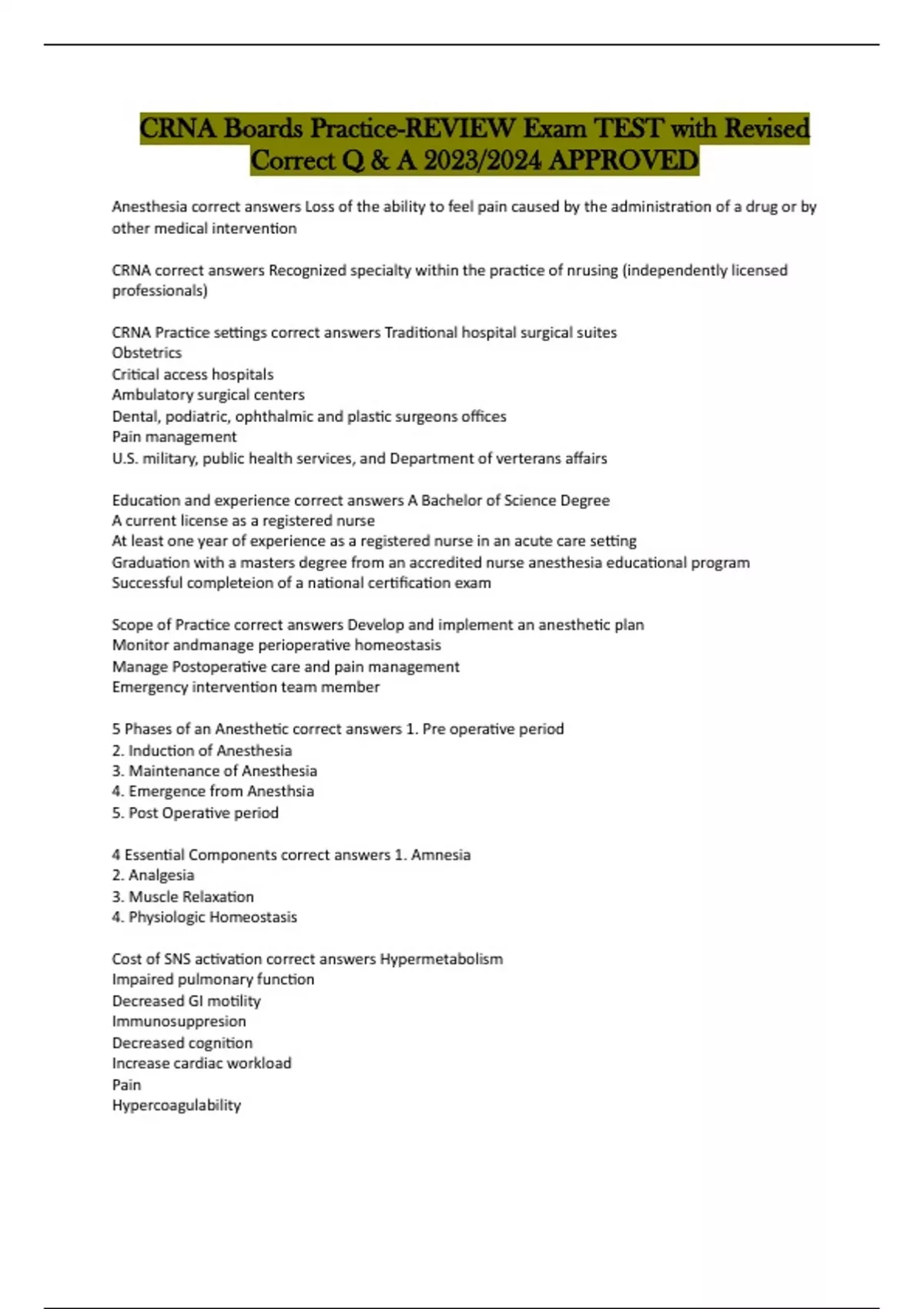 CRNA Boards Practice-REVIEW Exam TEST with Revised Correct Q & A 2023/2024 APPROVED