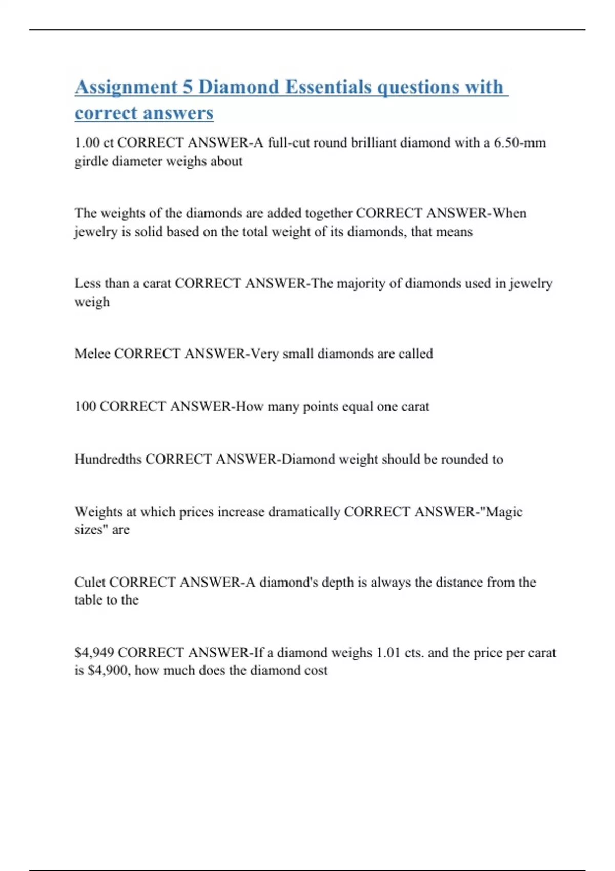 1.00 ct CORRECT ANSWER-A full-cut round brilliant diamond with a 6.50-mm girdle diameter weighs about The weights of the diamonds are added together CORRECT ANSWER-When jewelry is solid based on the total weight of its diamonds, that means Less than a carat CORRECT ANSWER-The majority of diamonds used in jewelry weigh Melee CORRECT ANSWER-Very small diamonds are called 100 CORRECT ANSWER-How many points equal one carat Hundredths CORRECT ANSWER-Diamond weight should be rounded to Weights at which prices increase dramatically CORRECT ANSWER-"Magic sizes" are Culet CORRECT ANSWER-A diamond's depth is always the distance from the table to the $4,949 CORRECT ANSWER-If a
