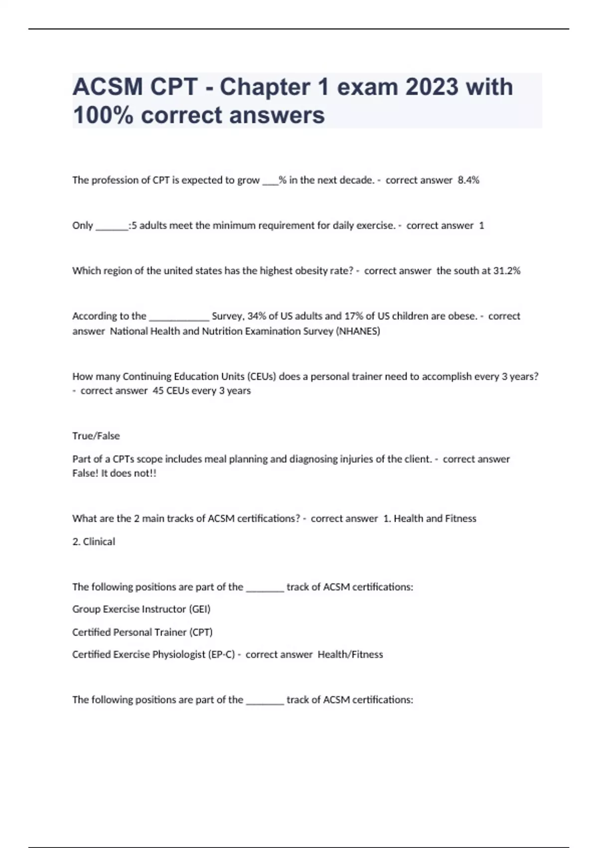 The profession of CPT is expected to grow ___% in the next decade. - correct answer 8.4% Only ______:5 adults meet the minimum requirement for daily exercise. - correct answer 1 Which region of the united states has the highest obesity rate? - correct answer the south at 31.2% According to the ___________ Survey, 34% of US adults and 17% of US children are obese. - correct answer National Health and Nutrition Examination Survey (NHANES) How many Continuing Education Units (CEUs) does a personal trainer need to accomplish every 3 years? - correct answer 45 CEUs every 3 years True/False Part of a CPTs scope includes meal planning and diagnosing injuries of the client. - correct answer False! It does not!! What are the 2 main tracks of ACSM certifications? - correct answer 1. Health and Fitness 2. Clinical The following positions are part of the _______ track of ACSM certifications: Group Exercise Instructor (GEI) Certified Personal Trainer (CPT) Certified Exercise Physiologist (EP-C) - correct answer Health/Fitness The following positions are part of the _______ track of ACSM certifications: Certified C