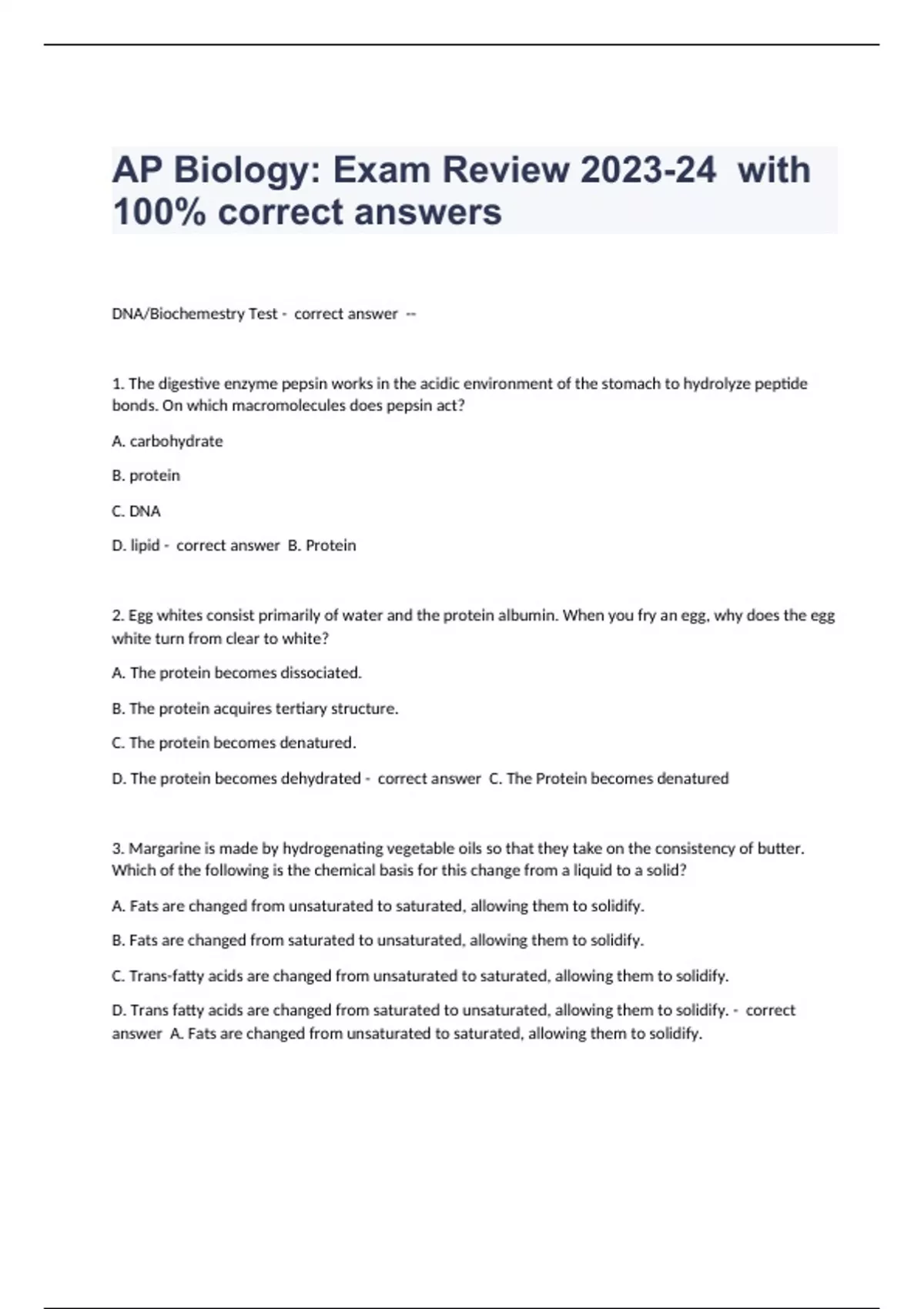 DNA/Biochemestry Test - correct answer -- 1. The digestive enzyme pepsin works in the acidic environment of the stomach to hydrolyze peptide bonds. On which macromolecules does pepsin act? A. carbohydrate B. protein C. DNA D. lipid - correct answer B. Protein 2. Egg whites consist primarily of water and the protein albumin. When you fry an egg, why does the egg white turn from clear to white? A. The protein becomes dissociated. B. The protein acquires tertiary structure. C. The protein becomes denatured. D. The protein becomes dehydrated - correct answer C. The Protein becomes denatured 3. Margarine is made by hydrogenating vegetable oils so that they take on the consistency of butter. Which of the following is the chemical basis for this change from a liquid to a solid? A. Fats are changed from unsaturated to saturated, allowing them to solidify. B. Fats are changed from saturated to unsaturated, allowing them to solidify. C. Trans-fatty acids are changed from unsaturated to saturated, allowing them to solidify. D. Trans fatty acids are changed from saturated to unsaturated, allowing them to solidify. - correct ans