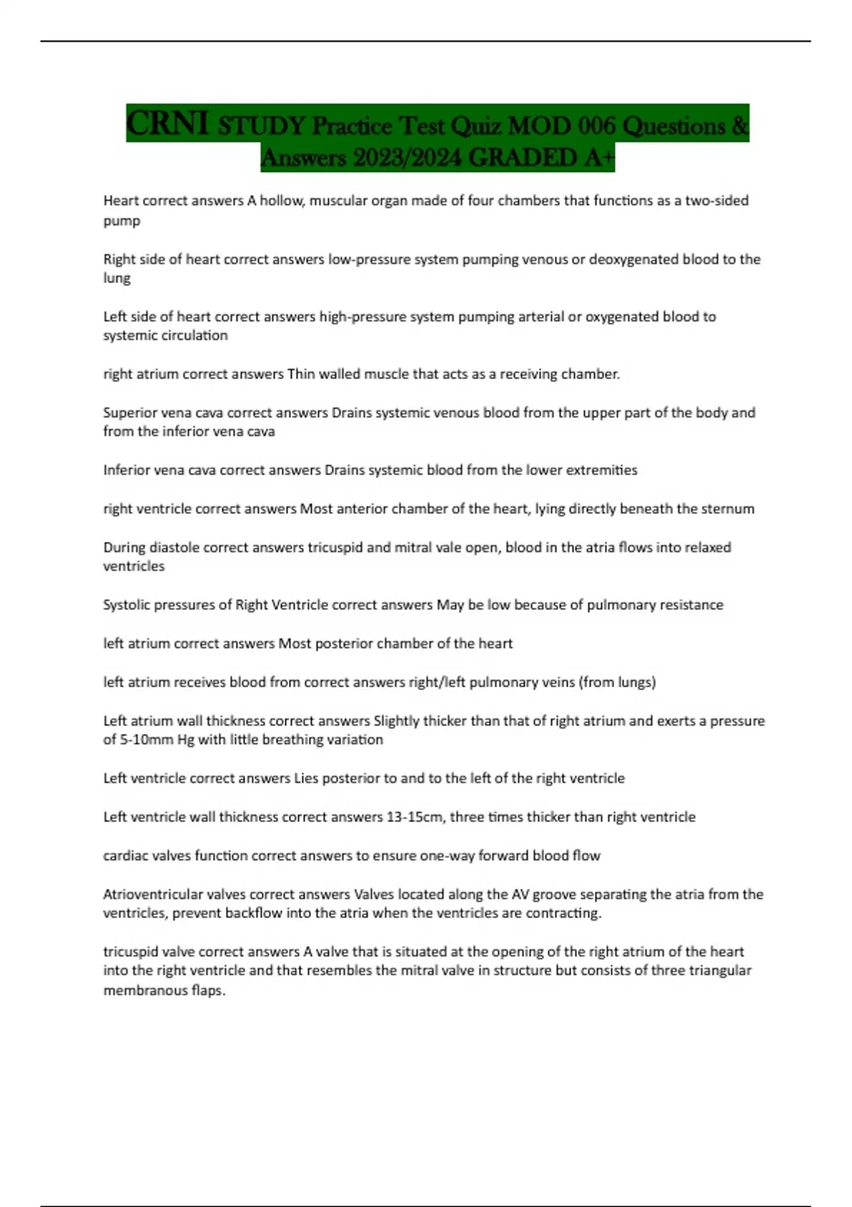 CRNI STUDY Practice Test Quiz MOD 006 Questions & Answers 2023/2024 GRADED A+ Heart correct answers A hollow, muscular organ made of four chambers that functions as a two-sided pump Right side of heart correct answers low-pressure system pumping venous or deoxygenated blood to the lung Left side of heart correct answers high-pressure system pumping arterial or oxygenated blood to systemic circulation right atrium correct answers Thin walled muscle that acts as a receiving chamber. Superior vena cava correct answers Drains systemic venous blood from the upper part of the body and from the inferior vena cava Inferior vena cava correct answers Drains systemic blood from the lower extremities right ventricle correct answers Most anterior chamber of the heart, lying directly beneath the sternum During diastole correct answers tricuspid and mitral vale open, blood in the atria flows into relaxed ventricles