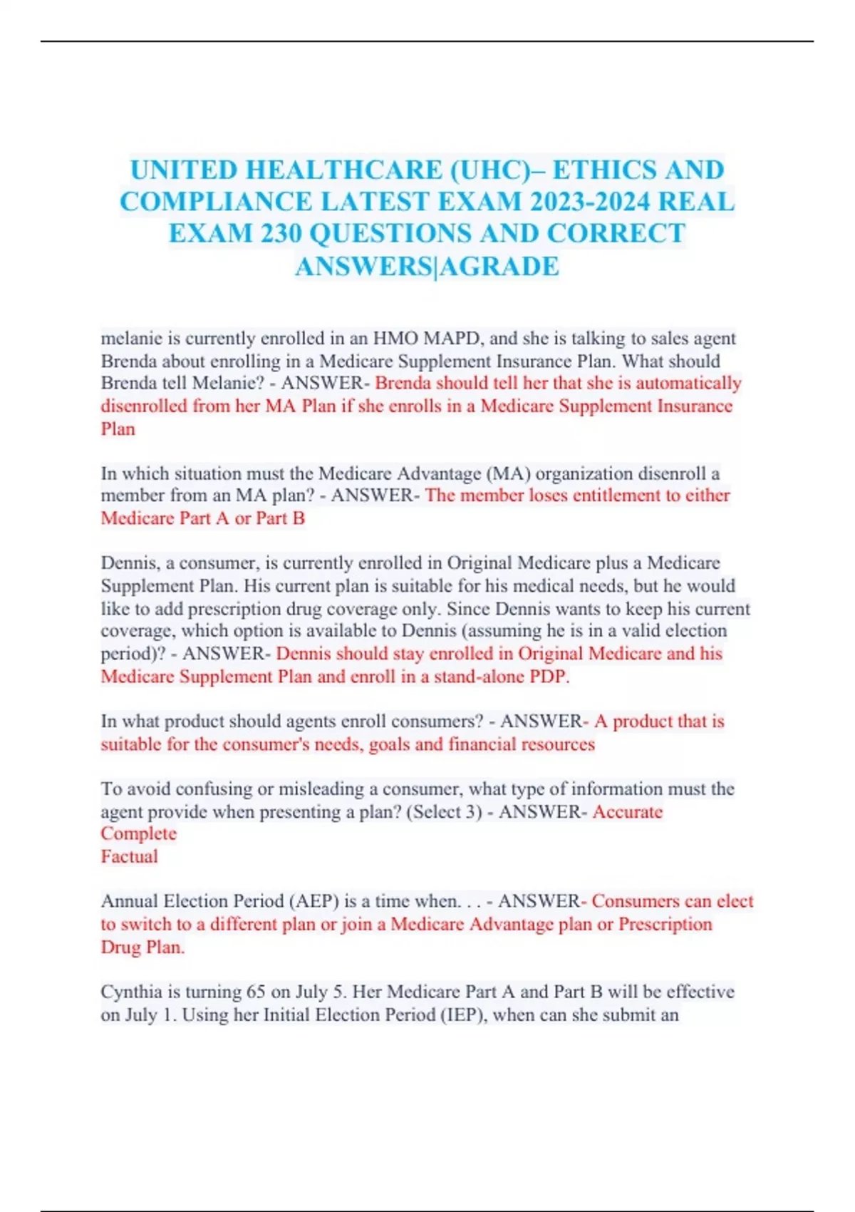 UNITED HEALTHCARE (UHC)– ETHICS AND COMPLIANCE LATEST EXAM REAL EXAM 230 QUESTIONS AND CORRECT ANSWERS|AGRADE