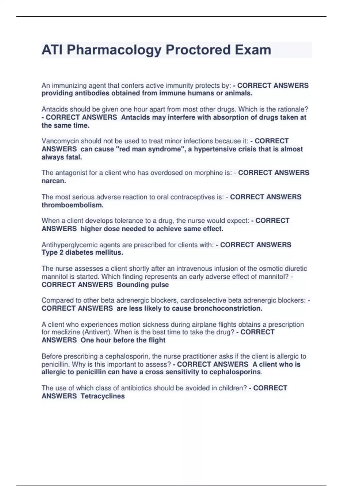 ATI Pharmacology Proctored Exam An immunizing agent that confers active immunity protects by: - CORRECT ANSWERS providing antibodies obtained from immune humans or animals. Antacids should be given one hour apart from most other drugs. Which is the rationale? - CORRECT ANSWERS Antacids may interfere with absorption of drugs taken at the same time. Vancomycin should not be used to treat minor infections because it: - CORRECT ANSWERS can cause "red man syndrome", a hypertensive crisis that is almost always fatal. The antagonist for a client who has overdosed on morphine is: - CORRECT ANSWERS narcan. The most serious adverse reaction to oral contraceptives is: - CORRECT ANSWERS thromboembolism. When a client develops tolerance to a drug, the nurse would expect: - CORRECT ANSWERS higher dose needed to achieve same effect. Antihyperglycemic agents are prescribed for clients with: - CORRECT ANSWERS Type 2 diabetes mellitus. The nurse assesses a client shortly after an intravenous infusion of the osmotic diuretic mannitol is started. Which finding represents an early adverse effect of mannitol? - CORRECT ANSWERS Bounding pulse Compared to other beta adrenergic blockers, cardioselective beta adrenergic blockers: - CORRECT ANSWERS are less likely to cause bronchoconstriction. A client who experiences motion sickness during airplane flights obtains a prescription for meclizine (Antivert). When is the best time to take the drug? - CORRECT ANSWERS One hour before the flight Before prescribing a cephalosporin, the nurse practitioner asks if the client is allergic to penicillin. Why is this important to assess? - CORRECT ANSWERS A client who is allergic to penicillin can have a cross sensitivity to cephalosporins. The use of which class of antibiotics should be avoided in children? - CORRECT ANSWERS Tetracyclines In a walk-in clinic, clients are often given intramuscular injections. Which drug should be readily available in case a client has an anaphylactic reaction? - CORRECT ANSWERS Epinephrine Thiazide and loop (high ceiling) diuretics are similar in that both: - CORRECT ANSWERS decrease tubular reabsorption of sodium and water. Which of the statements by the nurse most accurately describes the effects of declined plasma albumin levels in older adults? - CORRECT ANSWERS "There is an increased risk for adverse effects." To prevent oral fungal infections, the nurse should instruct the client who uses a beclomethasone inhaler to take which action? - CORRECT ANSWERS Rinse the mouth after each use. A client takes ethinyl estradiol/norgestimate (Ortho Tri-Cyclen) birth control pills. She calls the clinic and relates that she missed her medication yesterday. Which instructions will the nurse give? - CORRECT ANSWERS "Take two pills today then continue on a daily basis." The nurse may administer acetylcysteine (Mucomyst) inhalation to: - CORRECT ANSWERS facilitate mucus expectoration. Development of a chronic cough is an adverse effect associated with which class of anti-hypertensive drugs? - CORRECT ANSWERS Angiotensin converting enzyme (ACE) inhibitors The nurse may administer baclofen (Lioresal) for the treatment of which condition? - CORRECT ANSWERS Protracted muscle spasticity Oral diazepam (Valium), a benzodiazepine, has been prescribed for a client who has anxiety and muscle spasms. Which nursing intervention is appropriate for the care of this client? - CORRECT ANSWERS Assess for incoordination and daytime drowsiness. The nurse practitioner prescribed anhydrous theophylline (Theo-Dur) for the client with chronic bronchitis. With which disorder would the nurse practitioner reconsider the use of this medication? - CORRECT ANSWERS Hypertension When a client is receiving intravenous fluid with supplementary potassium chloride, it is especially important for the nurse to monitor for which potential adverse effect? - CORRECT ANSWERS Cardiac dsyrhythmias Which adverse effect is common for a client being treated with the antidepressant fluoxetine (Prozac)? - CORRECT ANSWERS Sexual dysfunction After giving a dose of dextromethorphan, an antitussive, which data reflects