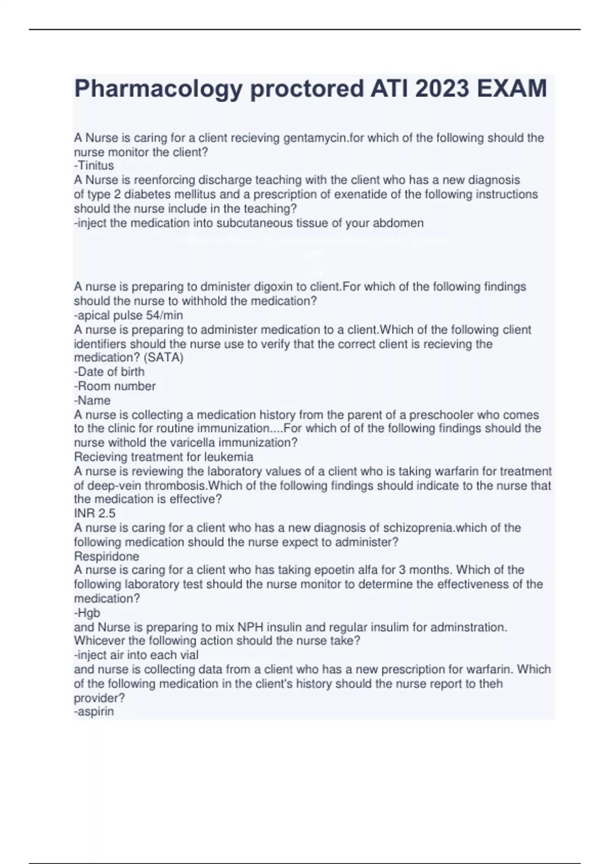 Pharmacology proctored ATI 2023 EXAM A Nurse is caring for a client recieving which of the following should the nurse monitor the client? -Tinitus A Nurse is reenforcing discharge teaching with the client who has a new diagnosis of type 2 diabetes mellitus and a prescription of exenatide of the following instructions should the nurse include in the teaching? -inject the medication into subcutaneous tissue of your abdomen 6 Ways to Show Appreciation for Your Child's Teacher 0:05 / 0:54 A nurse is preparing to dminister digoxin to client.For which of the following findings should the nurse to withhold the medication? -apical pulse 54/min A nurse is preparing to administer medication to a client.Which of the following client identifiers should the nurse use to verify that the correct client is recieving the medication? (SATA) -Date of birth -Room number -Name A nurse is collecting a medication history from the parent of a preschooler who comes to the clinic for routine immunization....For which of of the following findings should the nurse withold the varicella immunization? Recieving treatment for leukemia A nurse is reviewing the laboratory values of a client who is taking warfarin for treatment of deep-vein thrombosis.Which of the following findings should indicate to the nurse that the medication is effective? INR 2.5 A nurse is caring for a client who has a new diagnosis of of the following medication should the nurse expect to administer? Respiridone A nurse is caring for a client who has taking epoetin alfa for 3 months. Which of the following laboratory test should the nurse monitor to determine the effectiveness of the medication? -Hgb and Nurse is preparing to mix NPH insulin and regular insulim for adminstration. Whicever the following action should the nurse take? -inject air into each vial and nurse is collecting data from a client who has a new prescription for warfarin. Which of the following medication in the client's history should the nurse report to theh provider? -aspirin a nurse is reinforcing teaching with a client who has a prescription of phenytoin. Which of the following findings should the nurse include the sudden adverse effect of phenytoin? gingival hyperplasia a nurse who is preparing to administer medicatoins to a client is unfamiliar with the medicatoin that the client takes at home. Which of the following resources should the nurse consult? nursing drug guide a nurse is caring for a client who has a prescription of cephalexin 1 g PO daily to be given in divided doses every 6 hr available is cephalexin 250 mg tablets. How many tablets should the nurse adminster with each does? (road the answer to the nearest whole number. Use a leading zero if it applies. Do not use a trailing zero.) 1 tablet a nurse is caring for a client who is postoperative following Arthroscopy and erports a joint pain level of 6 on a scale of 0 to 10 after receiving ketorolac 1 hr ago. Which of the following action should the nurse take? administer oxycodone 5 mg orally a nurse is reinforcing teaching with a new licensed nurse about administration of meoprolol. Which of the following findings should the nurse identify as a contraindication for this medication? -sinus brady cardia a nurse is caring for a client who has hyperlipidemia and has been taking rosuvastatin for the past year. The client tells the nurse that he has been experiencing muscle tenderness. Which of the following laboratory values should the nurse review? -serum potassium a nurse is monitoring a client who recently began lisinopril for hypertension. Then there should identify that which of the following findings is an adverse effect of the medication to report to the provider? -persistent cough a nurse is reinforcing reaching aboutt he rights of medication administration to a newly licensed nurse. Then there should include which of the following as rights of medication administration? (SATA) -right time -right documentation -right medication -right dose a nurse is preparing to administer the hepatitis B vaccine IM to a 2-month-old infant. Which of the following actions should the nurse take? administer the vaccinen in the vastus lateralis a nurse is reinforcing teaching with a client who has a new prescription of furosemide. Which of the following shold the nurse include as an adverse effect of the medication that the client should erport to the provider? -visual disturbances a nurse is preparing to adminster phenobarbital 3mg/kg/day PO in two divided doses to a client who weighs 145 lbs. the amount avilable is phenobarb