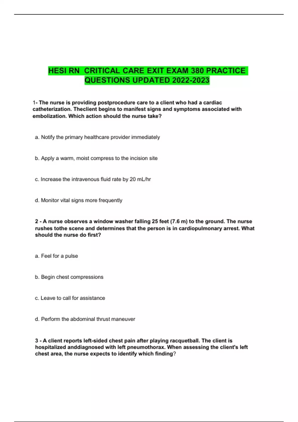 HESI RN CRITICAL CARE EXIT EXAM 380 PRACTICE