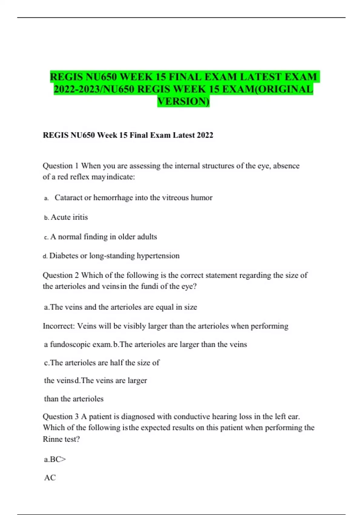 REGIS NU650 WEEK 15 FINAL EXAM. LATEST EXAM .