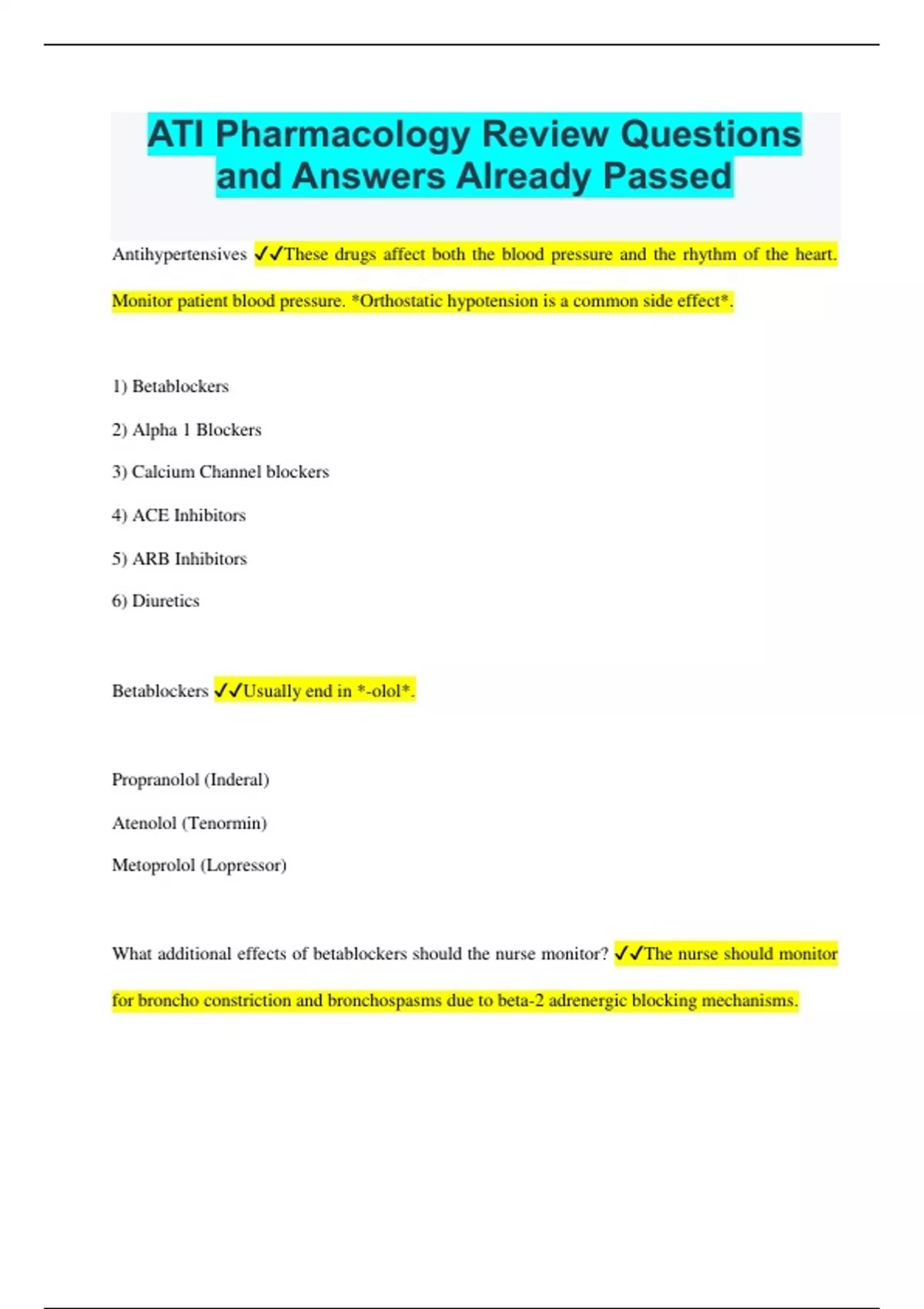 ATI Pharmacology Review Questions and Answers Already Passed
