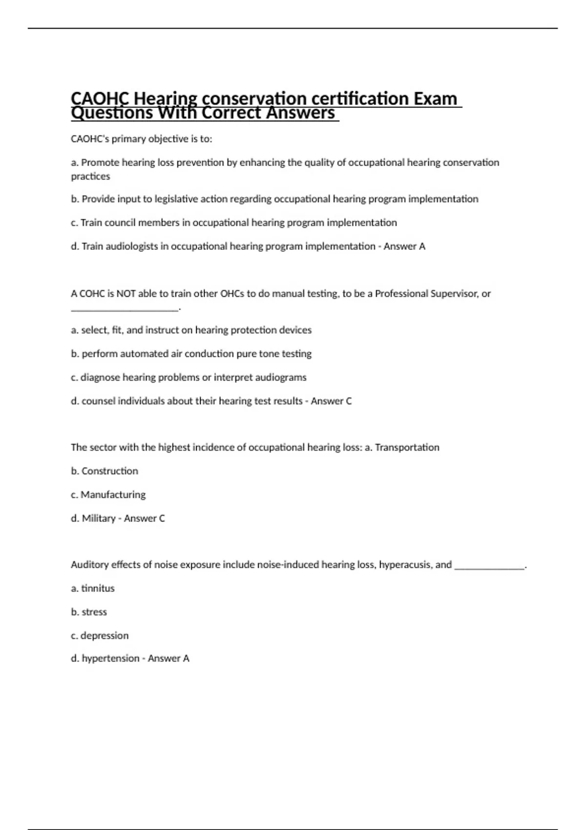 CAOHC Hearing conservation certification Exam Questions With Correct Answers