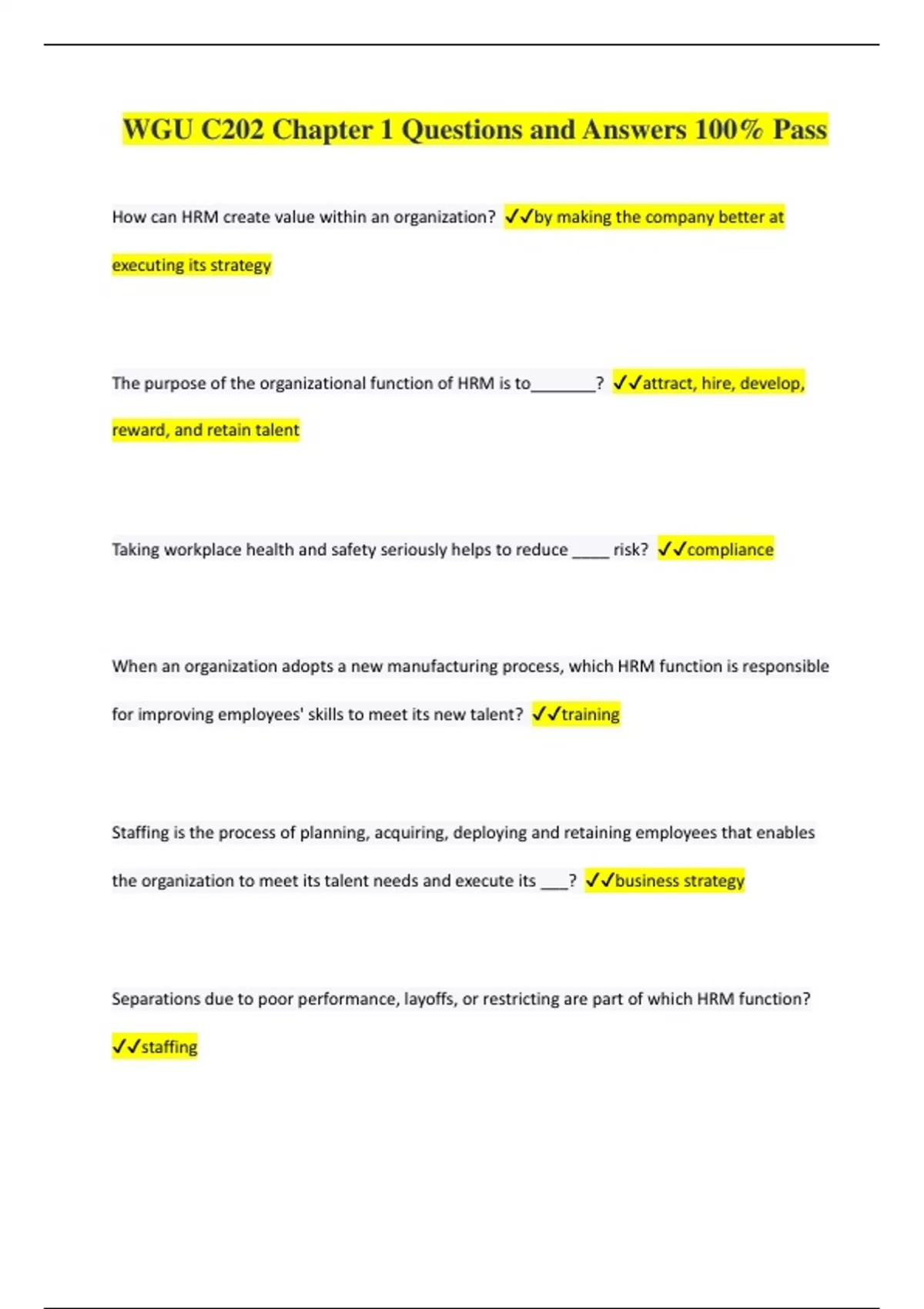 How can HRM create value within an organization? by making the company better at executing its strategy The purpose of the organizational function of HRM is to_______? attract, hire, develop, reward, and retain talent Taking workplace health and safety seriously helps to reduce ____ risk? compliance When an organization adopts a new manufacturing process, which HRM function is responsible