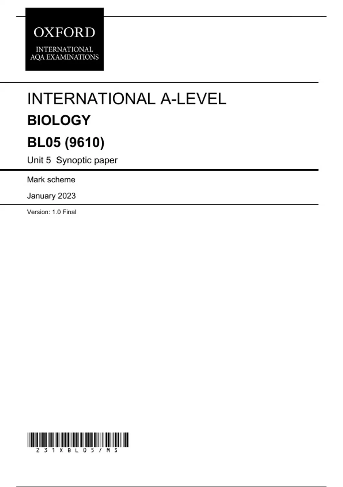 , MARK SCHEME – INTERNATIONAL A-LEVEL BIOLOGY – BL05 – JANUARY 2023
