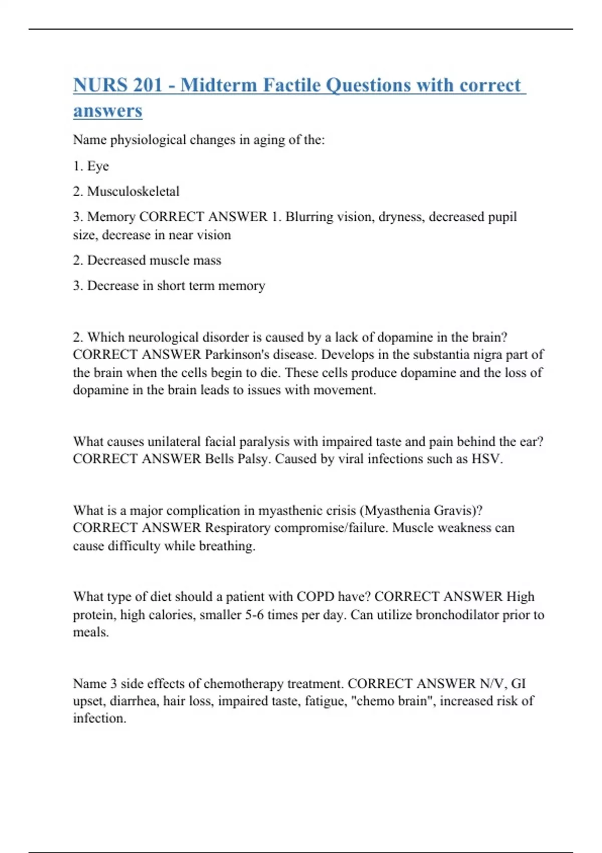 Name physiological changes in aging of the: 1. Eye 2. Musculoskeletal 3. Memory CORRECT ANSWER 1. Blurring vision, dryness, decreased pupil size, decrease in near vision 2. Decreased muscle mass 3. Decrease in short term memory 2. Which neurological disorder is caused by a lack of dopamine in the brain? CORRECT ANSWER Parkinson's disease. Develops in the substantia nigra part of the brain when the cells begin to die. These cells produce dopamine and the loss of dopamine in the brain leads to issues with movement. What causes unilateral facial paralysis with impaired taste and pain behind the ear? CORRECT ANSWER Bells Palsy. Caused by viral infections such as HSV. What is a major complication in myasthenic crisis (Myasthenia Gravis)? CORRECT ANSWER Respiratory compromise/failure. Muscle weakness can cause difficulty while breathing. What type of diet should a patient with COPD have? CORRECT ANSWER High protein, high calories, smaller 5-6 times per day. Can utilize bronchodilator prior to meals. Name 3 side effects of chemotherapy treatment. CORRECT ANSWER N/V, GI upset, diarrhea, hair loss, impaired taste, f