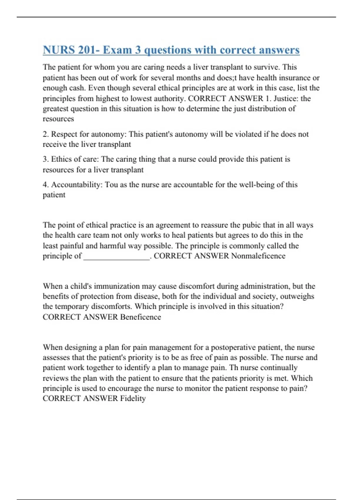 The patient for whom you are caring needs a liver transplant to survive. This patient has been out of work for several months and does;t have health insurance or enough cash. Even though several ethical principles are at work in this case, list the principles from highest to lowest authority. CORRECT ANSWER 1. Justice: the greatest question in this situation is how to determine the just distribution of resources 2. Respect for autonomy: This patient's autonomy will be violated if he does not receive the liver transplant 3. Ethics of care: The caring thing that a nurse could provide this patient is resources for a liver transplant 4. Accountability: Tou as the nurse are accountable for the well-being of this patient The point of ethical practice is an agreement to reassure the pubic that in all ways the health care team not only works to heal patients but agrees to do this in the least painful and harmful way possible. The principle is commonly called the principle of ________________. CORRECT ANSWER Nonmaleficence When a child's immunization may cause discomfort during administration, but the benefits of protection from disease, both for the individual and society, outweighs the temporary discomforts. Which principle is involved in this situation? CORRECT ANSWER Beneficence When designing a plan for pain management for a postoperative patient, the nurse assesses that the patient's priority is to be as free of pain as possible. The nurse and patient work together to identify a plan to manage pain. Th nurse continually reviews the plan with the patient to ensure that the patients priority is met. Which principle is used to encourage the nurse to monitor the patient response to pain? CORRECT ANSWER Fidelity