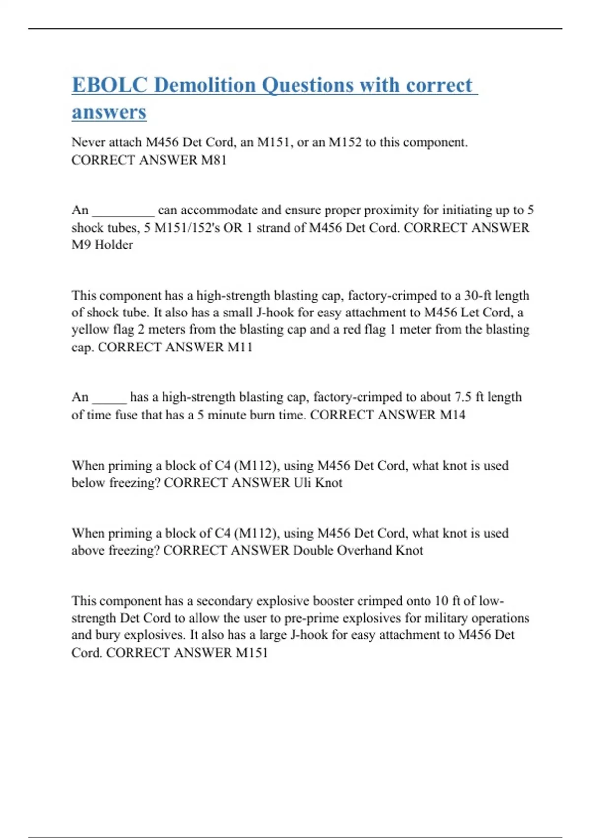 Never attach M456 Det Cord, an M151, or an M152 to this component. CORRECT ANSWER M81 An _________ can accommodate and ensure proper proximity for initiating up to 5 shock tubes, 5 M151/152's OR 1 strand of M456 Det Cord. CORRECT ANSWER M9 Holder This component has a high-strength blasting cap, factory-crimped to a 30-ft length of shock tube. It also has a small J-hook for easy attachment to M456 Let Cord, a yellow flag 2 meters from the blasting cap and a red flag 1 meter from the blasting cap. CORRECT ANSWER M11 An _____ has a high-strength blasting cap, factory-crimped to about 7.5 ft length of time fuse that has a 5 minute burn time. CORRECT ANSWER M14 When priming a block of C4 (M112), using M456 Det Cord, what knot is used below freezing? CORRECT ANSWER Uli Knot When priming a block of C4 (M112), using M456 Det Cord, what knot is used above freezing? CORRECT ANSWER Double Overhand Knot This component has a secondary explosive booster crimped onto 10 ft of low-strength Det Cord to allow the user to pre-prime explosives for military operations and bury explosives. It also has a large J-hook for easy attachment to M456 Det Cord. CORRECT ANSWER M151