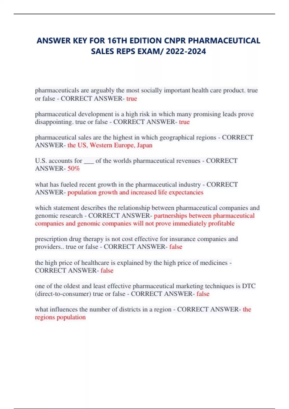 ANSWER KEY FOR 16TH EDITION CNPR PHARMACEUTICAL SALES REPS EXAM/