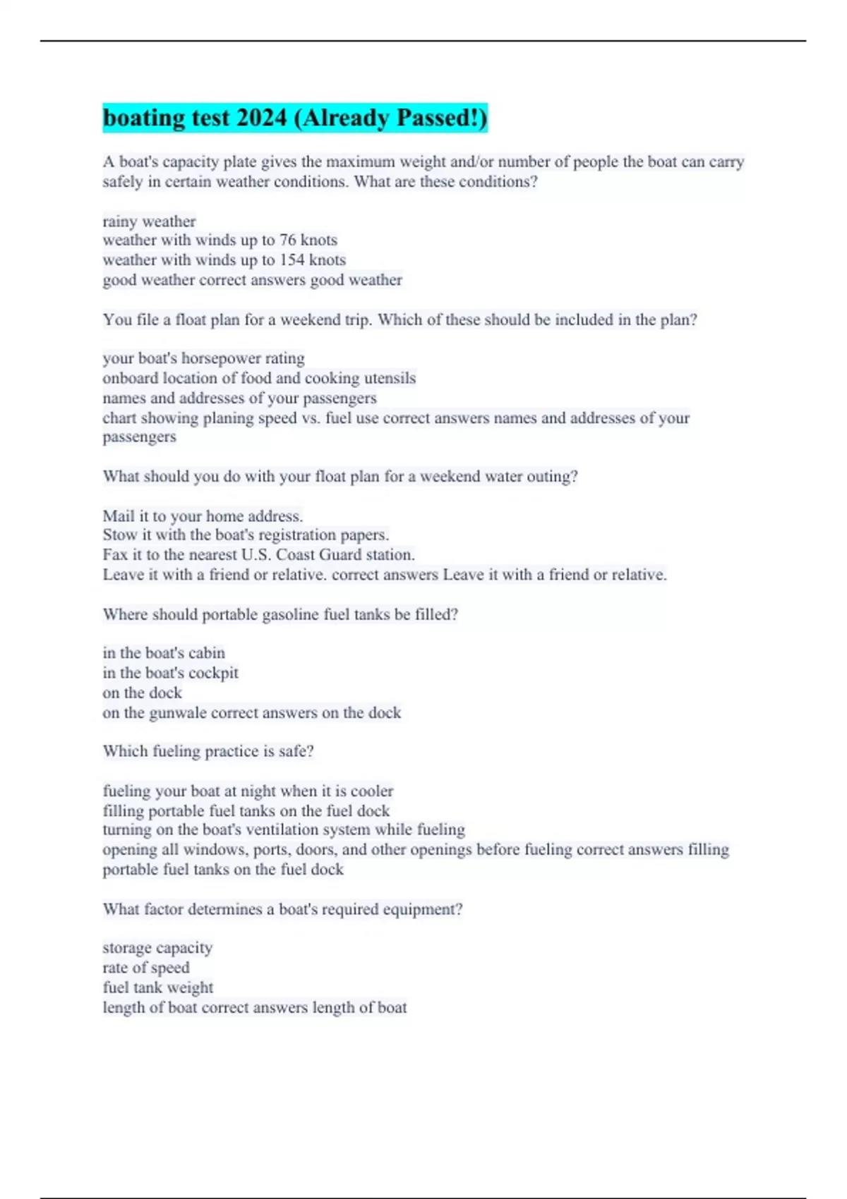 A boat's capacity plate gives the maximum weight and/or number of people the boat can carry safely in certain weather conditions. What are these conditions? rainy weather weather with winds up to 76 knots weather with winds up to 154 knots good weather correct answers good weather You file a float plan for a weekend trip. Which of these should be included in the plan? your boat's horsepower rating onboard location of food and cooking utensils names and addresses of your passengers chart showing planing speed vs. fuel use correct answers names and addresses of your passengers What should you do with your float plan for a weekend water outing? Mail it to your home address. Stow it with the boat's registration papers. Fax it to the nearest U.S. Coast Guard station. Leave it with a friend or relative. correct answers Leave it with a friend or relative. Where should portable gasoline fuel tanks be filled? in the boat's cabin in the boat's cockpit on the dock on the gunwale correct answers on the dock Which fueling practice is safe? fueling your boat at night when it is cooler filling portable fuel tanks on the fuel dock turning on the boat's ventilation system while fueling opening all windows, ports, doors, and other openings before fueling correct answers filling portable fuel tanks on the fuel dock What factor determines a boat's required equipment? storage capacity rate of speed fuel tank weight length of boat correct answers length of boat