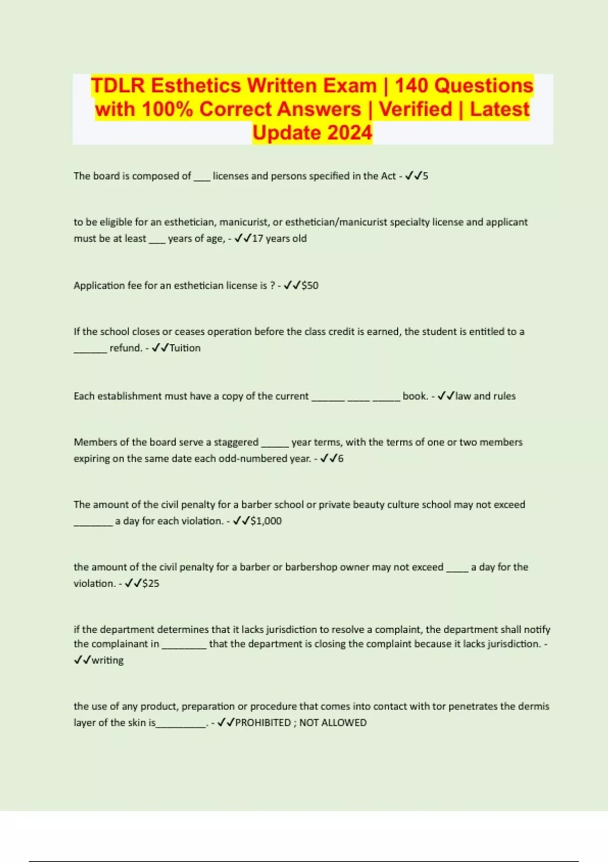 TDLR Esthetics Written Exam | 140 Questions with 100% Correct Answers | Verified | Latest Update 2024