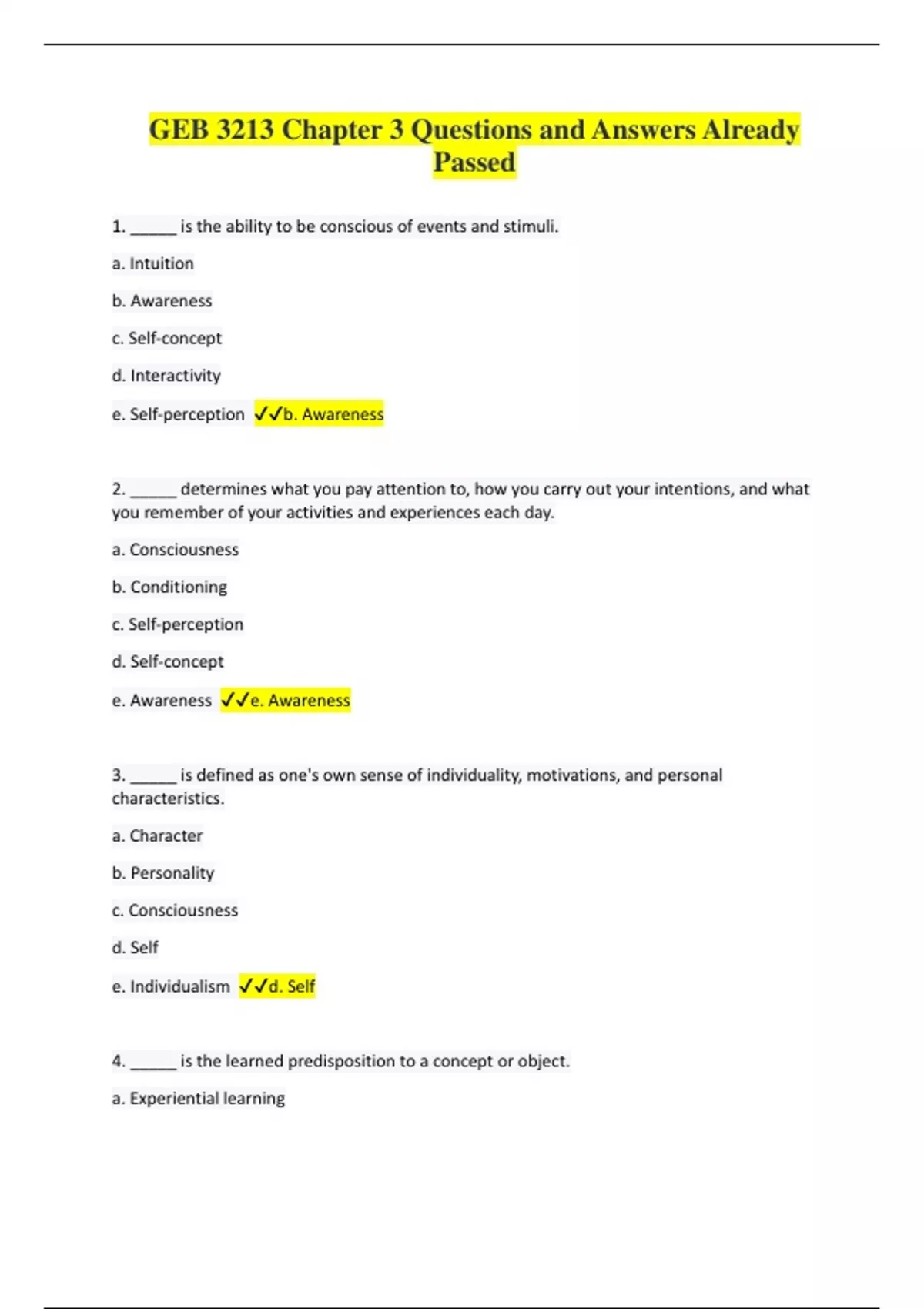 1. _____ is the ability to be conscious of events and stimuli. a. Intuition b. Awareness c. Self-concept d. Interactivity e. Self-perception b. Awareness 2. _____ determines what you pay attention to, how you carry out your intentions, and what you remember of your activities and experiences each day. a. Consciousness b. Conditioning c. Self-perception d. Self-concept e. Awareness e. Awareness