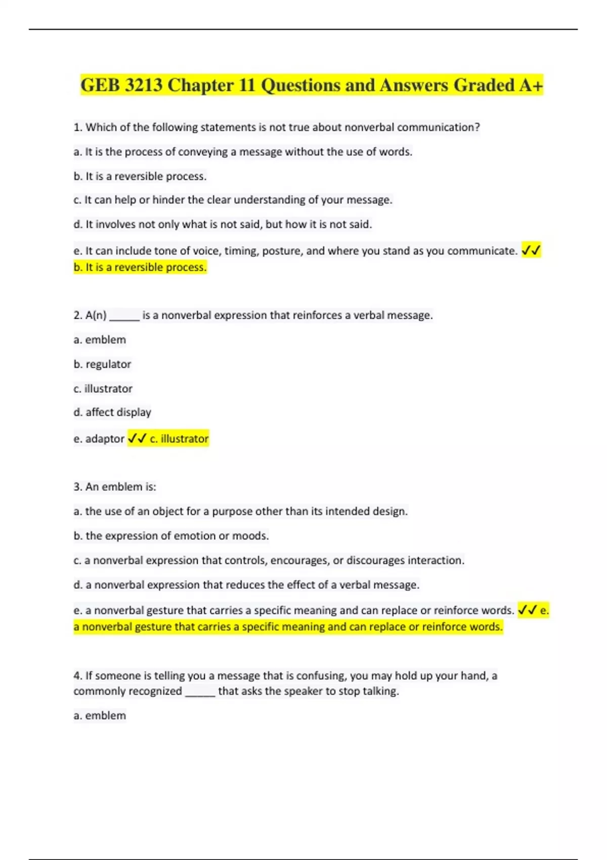1. Which of the following statements is not true about nonverbal communication? a. It is the process of conveying a message without the use of words. b. It is a reversible process. c. It can help or hinder the clear understanding of your message. d. It involves not only what is not said, but how it is not said. e. It can include tone of voice, timing, posture, and where you stand as you communicate. b. It is a reversible process.
