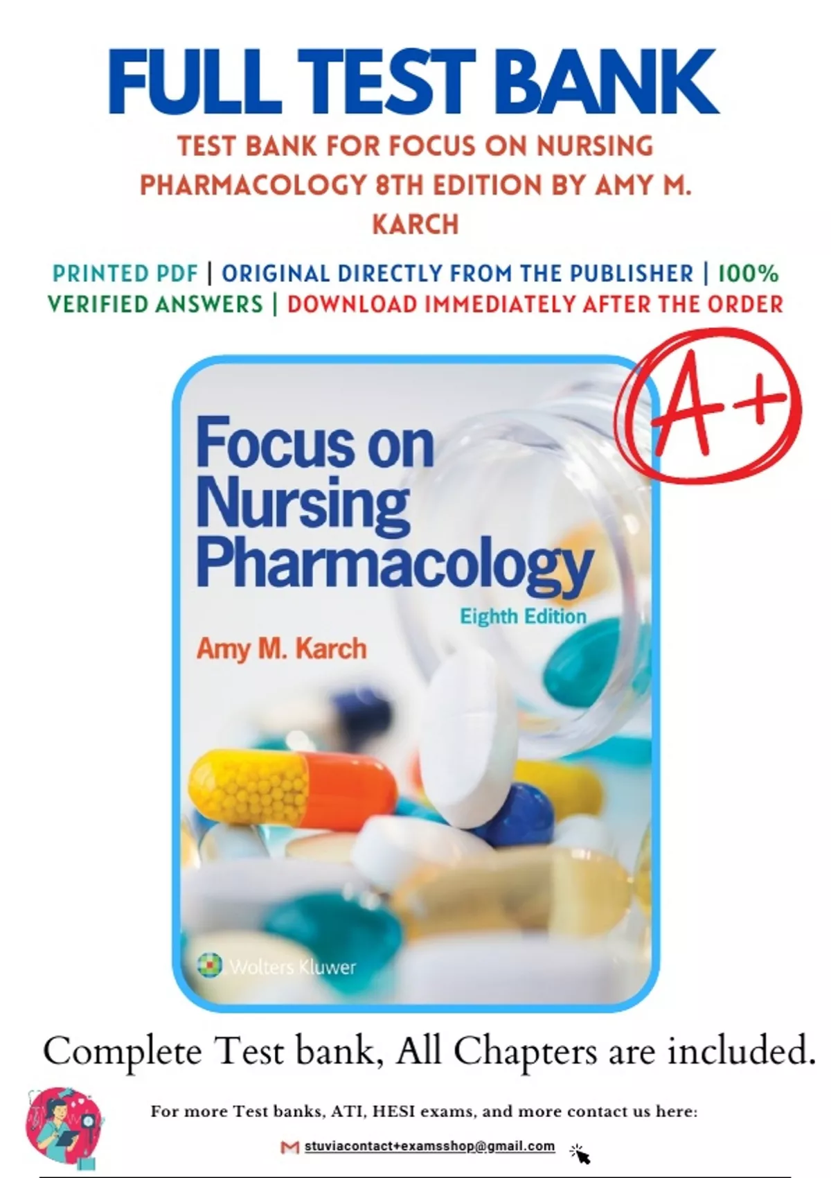 Test Bank For Focus on Nursing Pharmacology 8th Edition by Karch | 9781975100964 | All Chapters with Answers and Rationals . Instant Delivery .