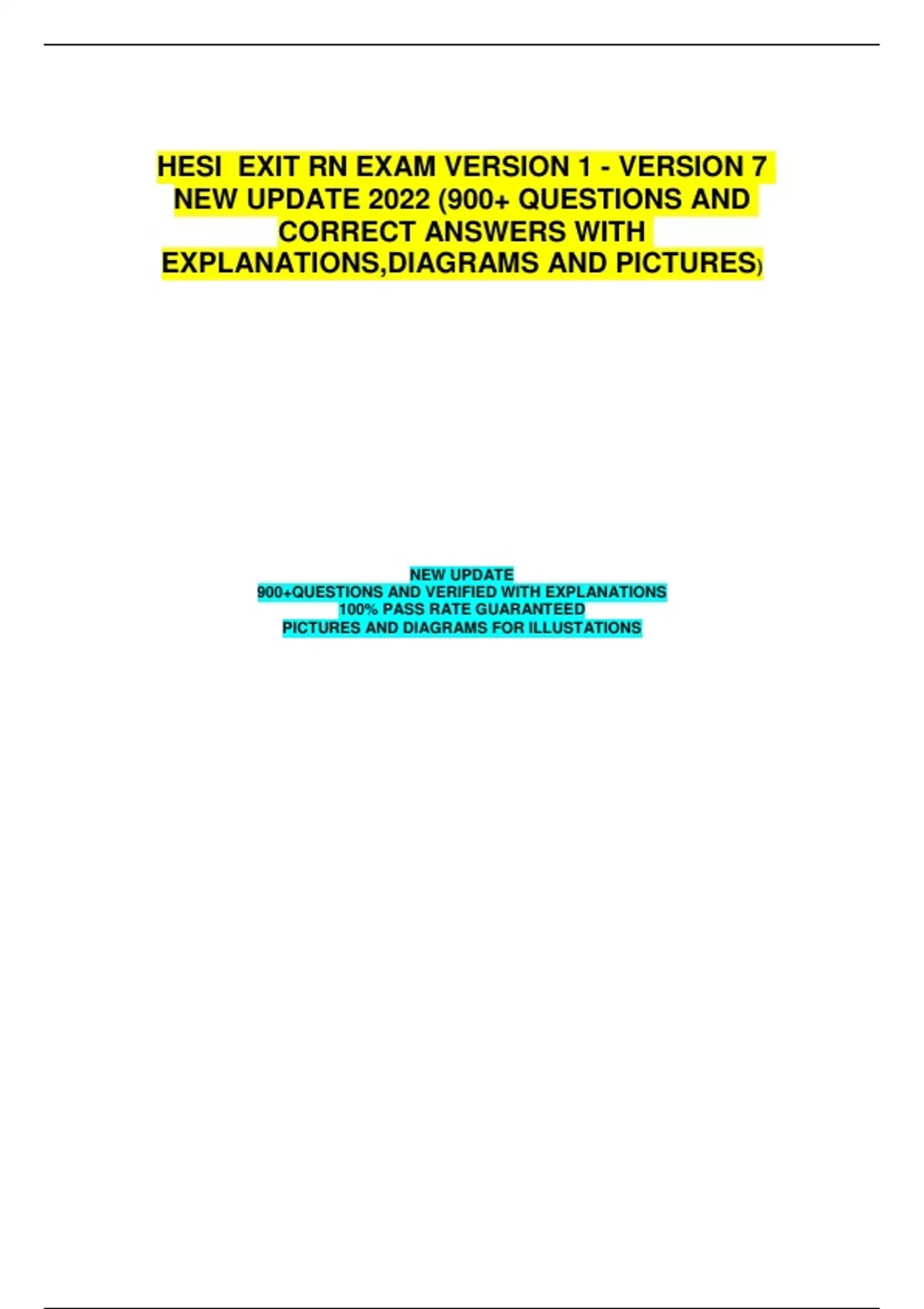 HESI EXIT RN EXAM VERSION 1 - VERSION 7 NEW UPDATE 2022 (900+ QUESTIONS AND CORRECT ANSWERS WITH EXPLANATIONS,DIAGRAMS AND PICTURES) NEW UPDATE 900+QUESTIONS AND VERIFIED WITH EXPLANATIONS 100% PASS RATE GUARANTEED PICTURES AND DIAGRAMS FOR ILLUSTATIONS