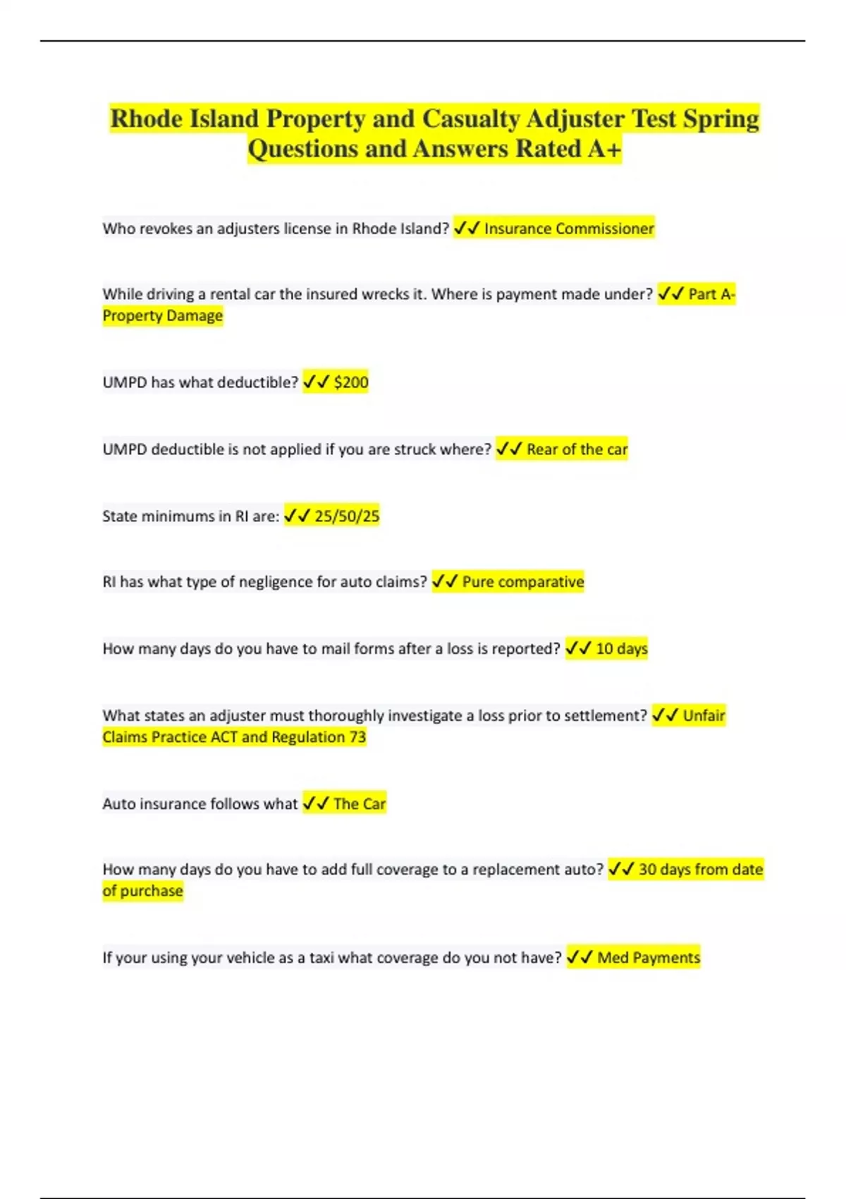 Rhode Island Property and Casualty Adjuster Test Spring Questions and Answers Rated A+