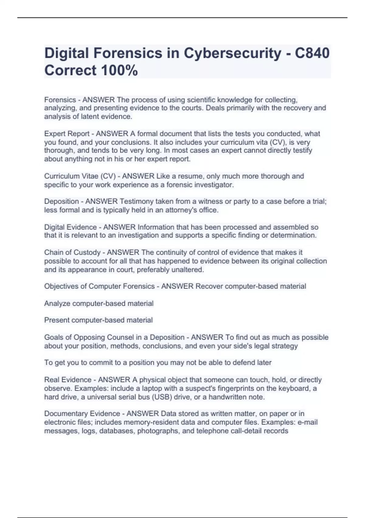 Forensics - ANSWER The process of using scientific knowledge for collecting, analyzing, and presenting evidence to the courts. Deals primarily with the recovery and analysis of latent evidence. Expert Report - ANSWER A formal document that lists the tests you conducted, what you found, and your conclusions. It also includes your curriculum vita (CV), is very thorough, and tends to be very long. In most cases an expert cannot directly testify about anything not in his or her expert report. Curriculum Vitae (CV) - ANSWER Like a resume, only much more thorough and specific to your work experience as a forensic investigator. Deposition - ANSWER Testimony taken from a witness or party to a case before a trial; less formal and is typically held in an attorney's office. Digital Evidence - ANSWER Information that has been processed and assembled so that it is relevant to an investigation and supports a specific finding or determination. Chain of Custody - ANSWER The continuity of control of evidence that makes it possible to account for all that has happened to evidence between its original collection and its appearance in court, preferably unaltered. Objectives of Computer Forensics - ANSWER Recover computer-based material Analyze computer-based material Present computer-based material Goals of Opposing Counsel in a Deposition - ANSWER To find out as much as possible about your position, methods, conclusions, and even your side's legal strategy To get you to commit to a position you may not be able to defend later Real Evidence - ANSWER A physical object that someone can touch, hold, or directly observe. Examples: include a laptop with a suspect's fingerprints on the keyboard, a hard drive, a universal serial bus (USB) drive, or a handwritten note. Documentary Evidence - ANSWER Data stored as written matter, on paper or in electronic files; includes memory-resident data and computer files. Examples: e-mail messages, logs, databases, photographs, and telephone call-detail records Testimonial Evidence - ANSWER Information that forensic specialists use to support or interpret real or documentary evidence Demonstrative Evidence - ANSWER Information that helps explain other evidence. An example is a chart that explains a technical concept to the ju