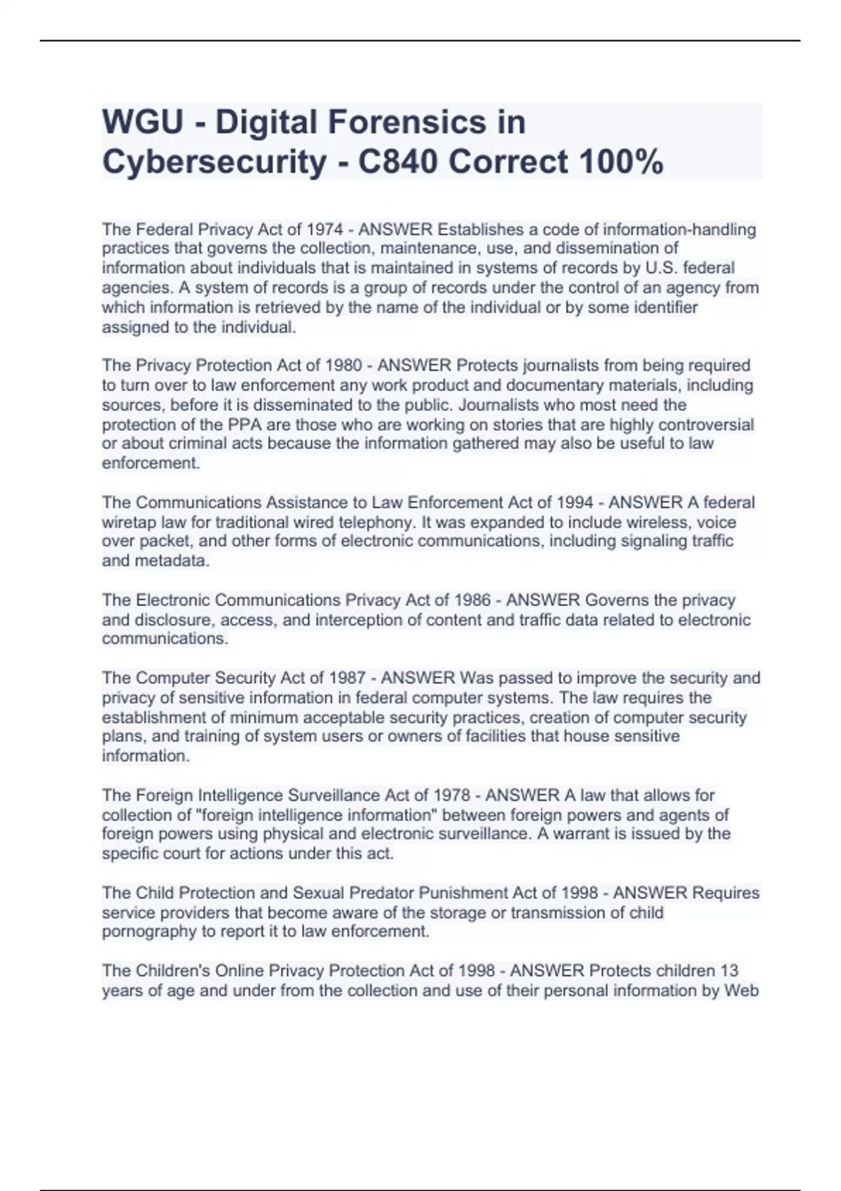 WGU - Digital Forensics in Cybersecurity - C840 Correct 100%