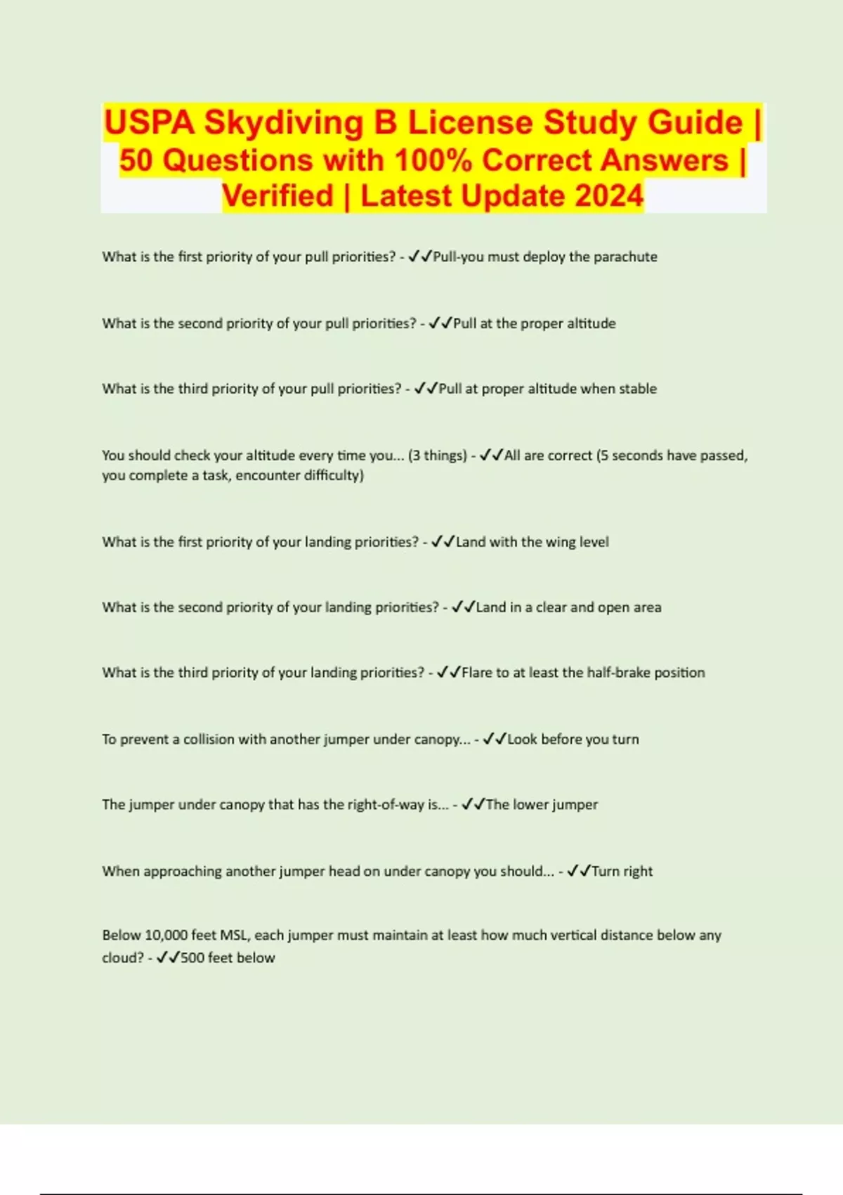USPA Skydiving B License Study Guide | 50 Questions with 100% Correct Answers | Verified | Latest Update 2024